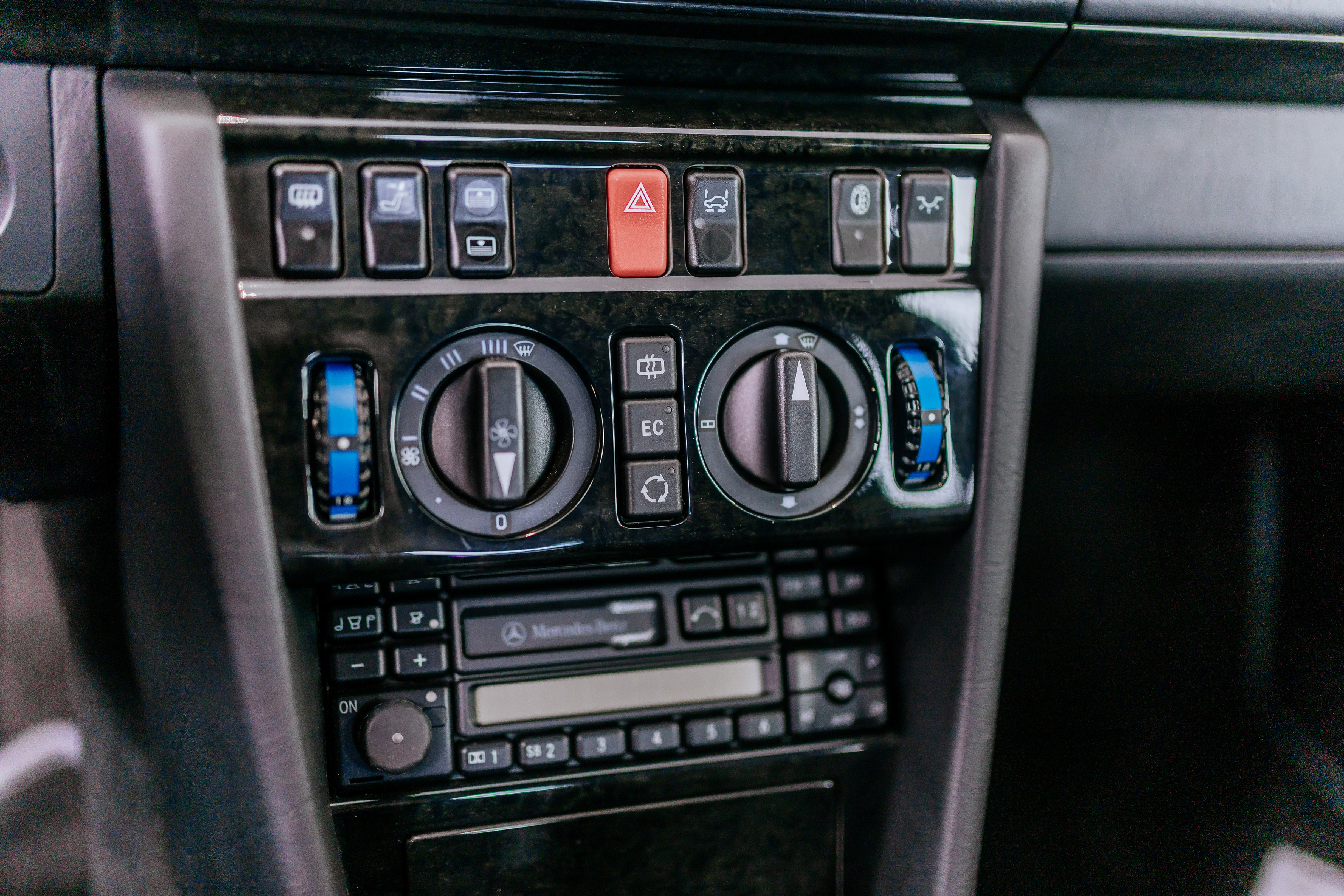步入車廂,Limited 版本的專屬豪華程度遠超一般型號。車內配備了當時極為先進的運動化座椅,方向盤與門板均採用高品質彩色軟質皮革包裹。此車選用了代號為 288 的黑灰色皮面,搭配經過黑染處理的鳥眼楓木飾板(Bird’s-eye maple)。從自動變速箱排檔頭到地氈,甚至是隨車的文件皮套,都與內裝配色完美呼應。這種對於細節的極致追求,正是當年 Mercedes-Benz 「工程領先」時代的縮影。