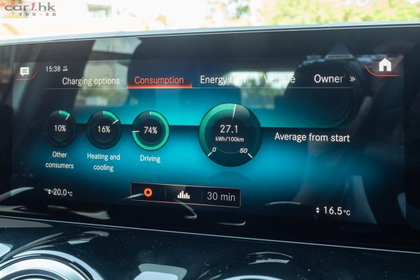 屏幕內同可找到 Dynamic Select 系統、氣氛燈光、前座按摩、後泊鏡頭這些,電動車自有充電設定、耗電量和能量流程顯示。