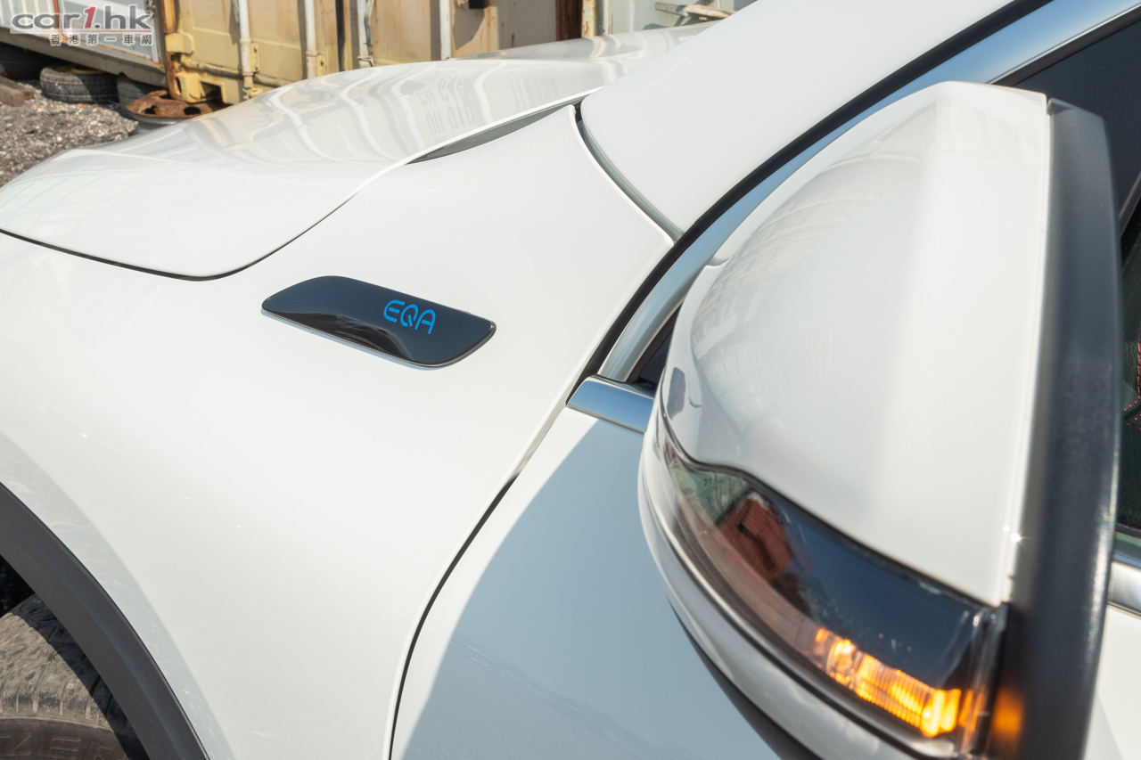正如一般 SUV 常見的造型,要有前、後泵把護片、黑膠下身包圍、車頂行李架這些「SUV 化」設計,EQA 亦循例有平治電動車國度裡的「Black panel」黑色一塊的封閉式鬼面罩、串起頭、尾燈組的 LED 光條、頭燈內的藍色「眼線」、有藍色「EQA」字的沙板裝飾塊、低風阻輪圈、低風阻泵把、低風阻門邊鏡、優化了的車底封板和頭燈封邊等,作為 SUV 的它,當然亦有黑膠下身和輪拱,作為電動車的它,當然沒有尾喉而有較多銀色裝飾的尾泵把;後車牌框則由尾門改放在泵把內。