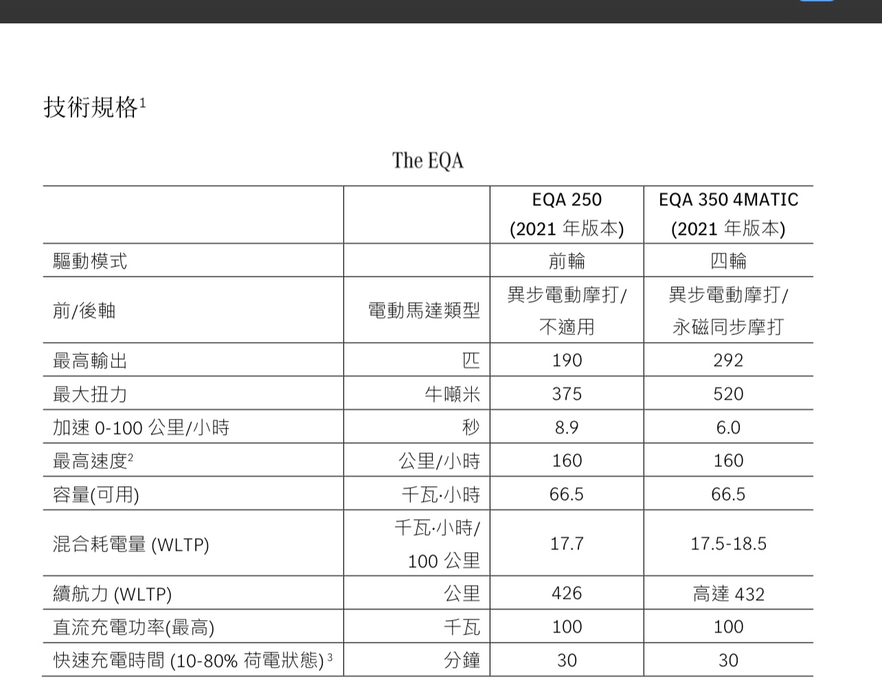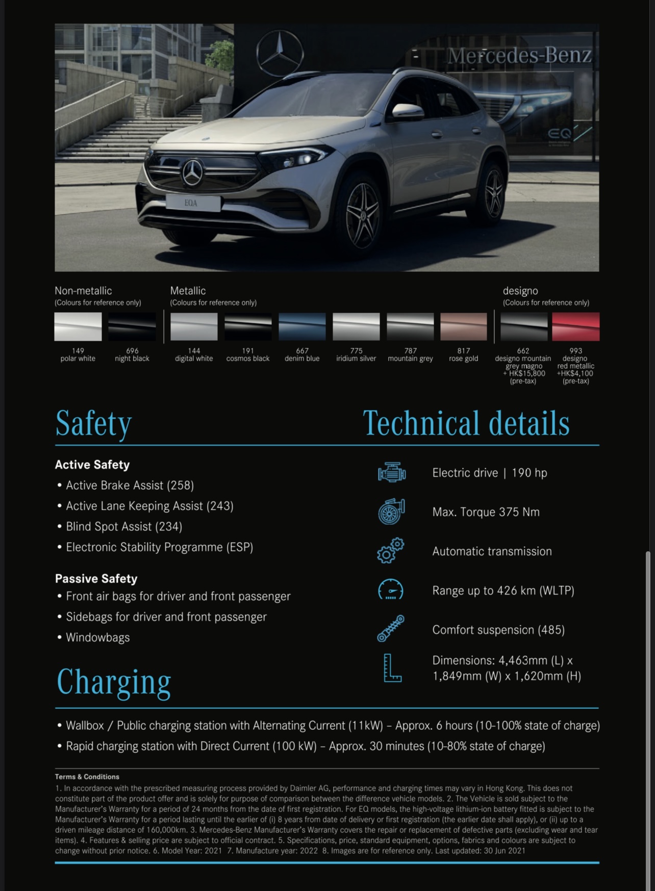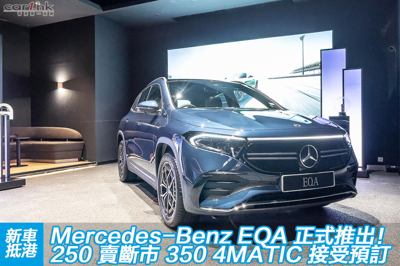香港 Mercedes-Benz 首先推出的 EQA 型號為 EQA 250,最大馬力為 190 匹,最長續航距離為 426 公里(WLTP 標準)。放於車輛底部的雙層鋰電池為車架結構的一部份,其容量為 66.5kWh。為貫徹品牌向來 對噪音和震動抑制的高要求,電能驅動系統以複雜方法與車陣、車身分隔,並用上大量吸震措施。不過,EQA 250 2021 年供貨名額早就被賣清,現在已經預訂到 2022 生產的貨源,另外,香港同時推出 350 4MATIC,已經接受預訂。