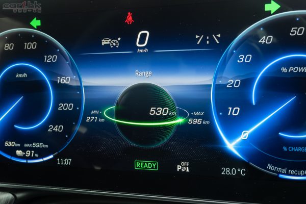 屬 350 4MATIC 規格的這部,前後雙摩打共有 292 匹 / 765 牛頓米輸出(我們早前試過的單摩打後驅 EQE 350 有 292 匹 / 565 牛頓米),前摩打於低負荷時可由 DCU(Disconnect Unit)切斷電能停止運行,減少阻力和耗電量,從屏幕的動力流程圖可以得知。89kWh 容量電池提供達 561km 續航力。