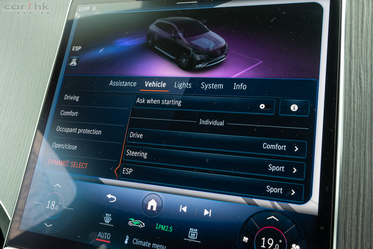 車子 0-100km/h 加速需不算很快的 6.6 秒,不至壓得人眼壓飈升,這完全沒問題,極速 210km/h。行車期間可參與的,同有電動車界中其一最易用的拖慢充電控制,軚盤 +/- 撥片可選擇「D +」滑行(Coasting)、「D」正常拖慢、「D-」強度拖慢,和可因應車前情況自動改變拖慢度的「D Auto」,不需像 Tesla 和 Polestar 般要從屏幕揀選一番才可改動。Dynamic Select 反應系統除 Eco、Comfort 和 Sport 模式外,Individual 可自定踩電反應、軚盤重量、ESP 穩定系統反應,四驅型號另有可協調分動作越野駕駛和「電門」反應較平順的 Offroad 模式,採用標準 Comfort 鐵彈簧避震的這部沒有懸掛軟硬可改,要加 $22,200 用 Airmatic 氣壓避震才有。與EQE一樣的隔音設計,摩打內的磁石和轉子有減震設計,摩打有「偈躉膠」和海綿墊來隔掉震動和噪音,車架的空隙內藏有隔音海棉,行車幼滑和細緻程度比高級豪華房車更高,不過沉重的身軀加上升高了的重心令車身傾側幅度較大,急彎時就是重磅的高身 SUV 般較易嚮胎,但電動四驅車的分動和維穩反應一向比電油車快,容易令人覺得像很咬地似的。有 10 度的後輪轉向需 $16,500 另購。下坡限速控制 DSR(Downhill Speed Regulator)和 Creep 蠕動要在屏幕裡找尋。從音響系統播放出來的背景音效,標準有「咕咕…」聲像扮 Engine 的「Silver Waves」和像電鑽「wee…」聲的「Vivid Flux」,車主可自行下載機械感強的「Roaring Pulse」和新出的「Serene Breeze」,話說是一感覺與大自然親近的舒暢聲調。