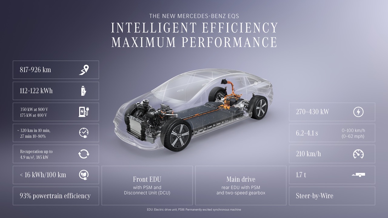 新一代 EQS 最令人震撼的數據,莫過於其高達 926 公里的 WLTP 續航里程(EQS 450+ 錶現)。相比前作,續航力大幅提升了 13%,這意味著用家可以由德國慕尼黑一路開到法國巴黎,中途完全不需要進入充電站。