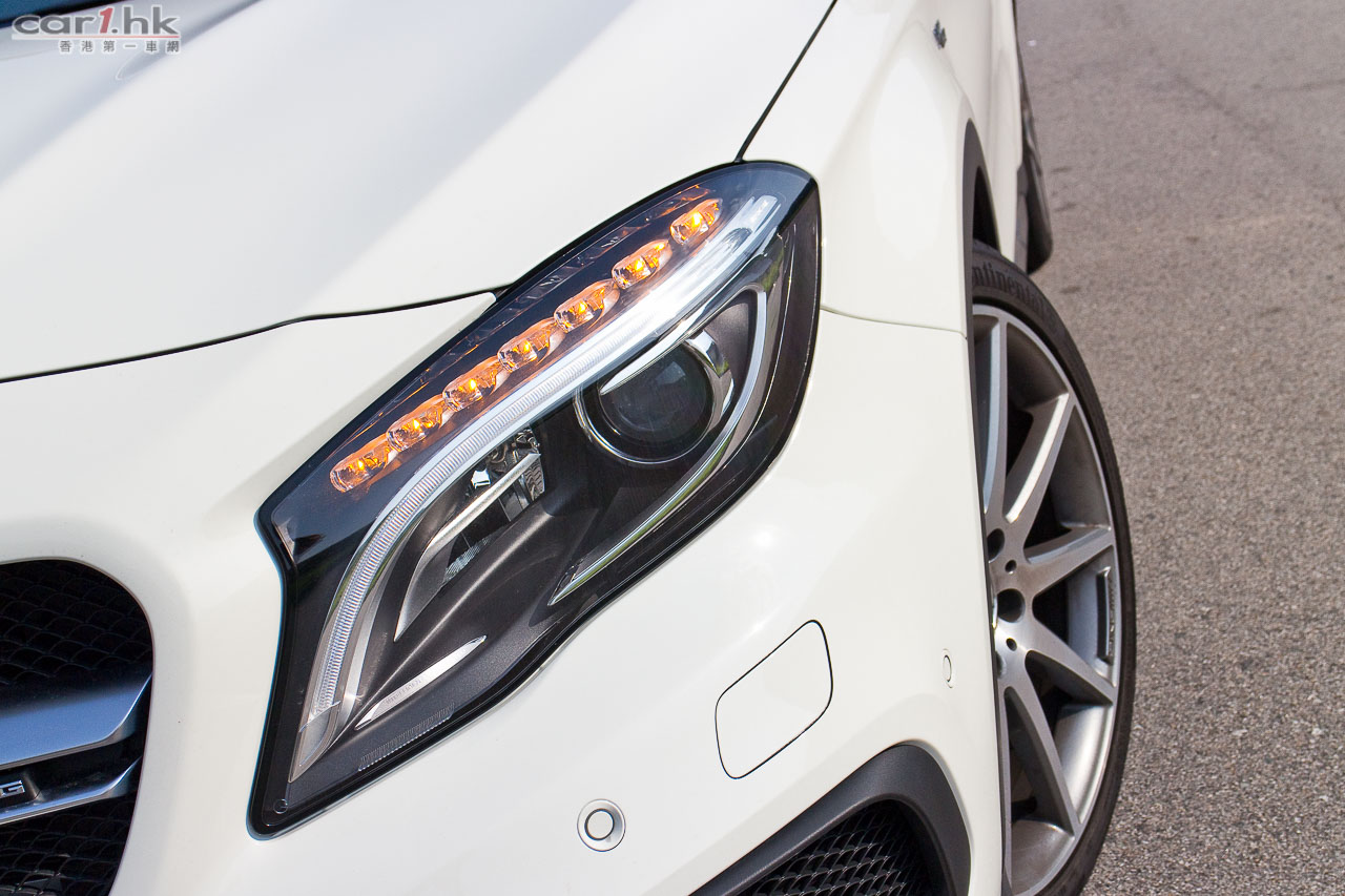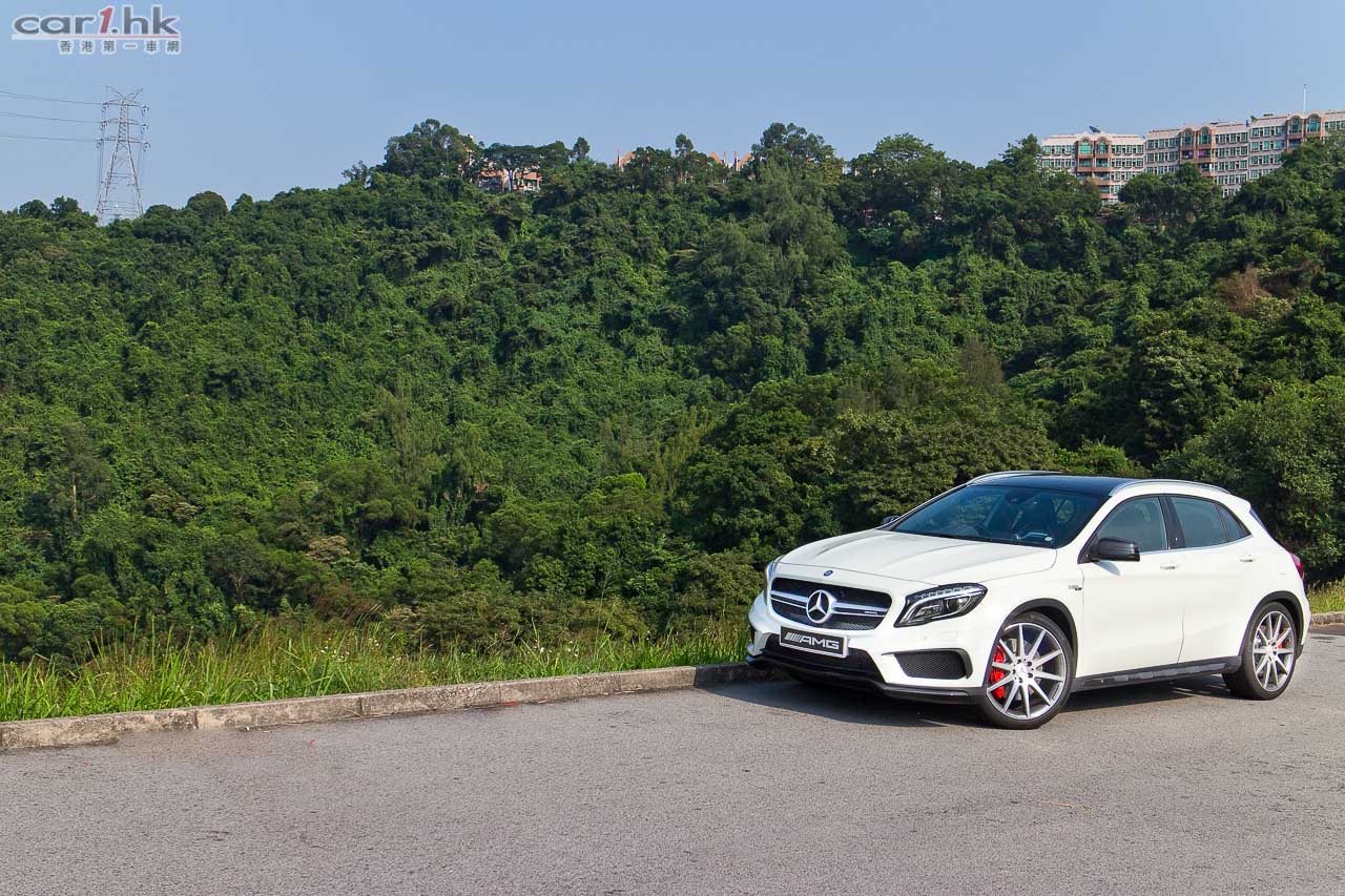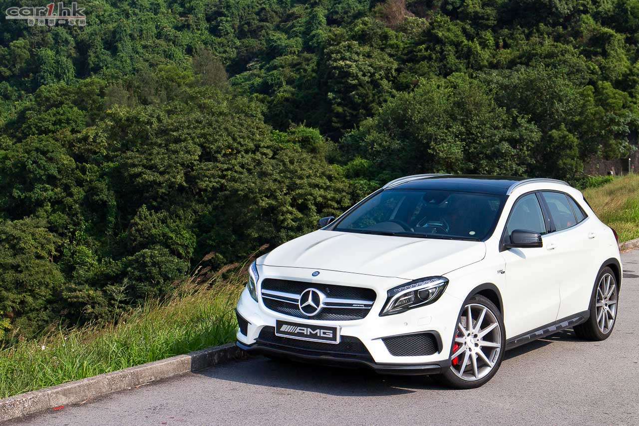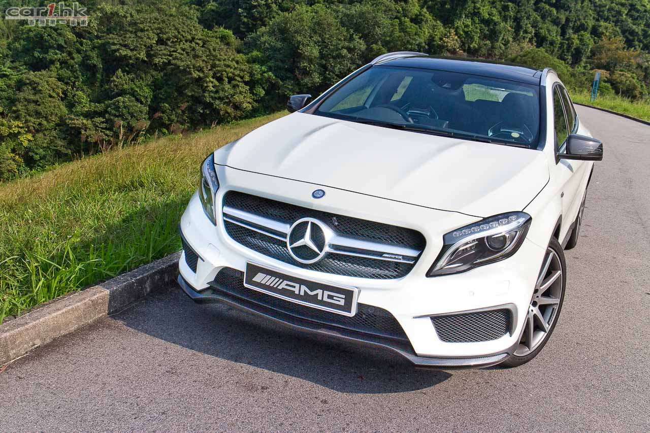 之前對 A 和 CLA 45 的經驗是,兩車起步時要先經四汽缸引擎低轉的低扭力和低渦輪壓力,等一等後 turbo 才谷一谷啖氣將人壓後;GLA 45 有同樣的反應,而其車重比 A 和 CLA 45 略高,0-100km/h加速比它們稍慢,需 4.8 秒,感覺上亦稍稍不及它們壓得兇猛。引擎聲浪低沉實淨,同樣於較高轉數約 6,000 轉時開始發出「zzz..」的微震,像大啖氣索入引擎般;有 C、S 和 M 模式可揀的波箱,在 S 和 M 時轉波速度很快很爽,AMG 車 M 模式時不會在紅線自動幫你轉波,不似例如 Audi 的 S tronic 會自動轉;所說的「停滯」功能,在每轉高波時帶來「及…及…」的聲響和少少 chok 頸,其他汽車只在 Audi 的 S 和 RS 系列中聽過,超爽!本身更沉更厚的 AMG 排氣喉聲調,在高轉收油時與 A 和 CLA 45 一樣會出現「啪啪…啪啪…」的爆響,每次收油,你都會望望有否途人聽到,很值得自豪!在硬化得來絕不辛苦的 AMG 懸掛調校下,車子有更強抗傾力,穩陣得多,操控更加平衡;快彎時踩油的動態與另外兩部 AMG 車一樣,前輪稍甩,四驅系統便即將扭力撥向車後,讓四輪齊齊幫車向前爪著路去,舉止完全一樣。三部初級 AMG 車中,A 45 賣 $737,000,CLA 45 賣 $808,500,GLA 45 最貴,賣 $812,000,其價格分佈亦很合理,當三架同時應市之後,相信對貨源緊張問題會有一定舒緩。