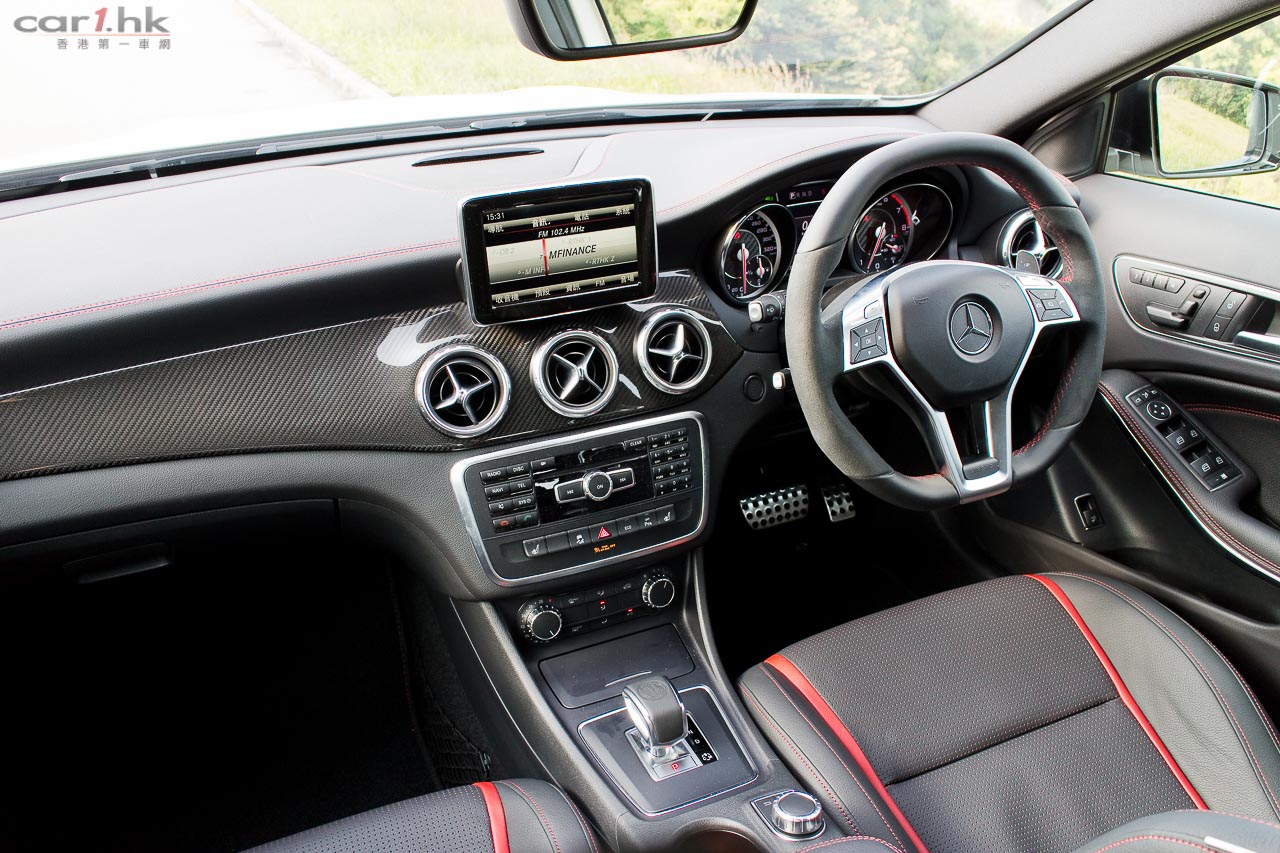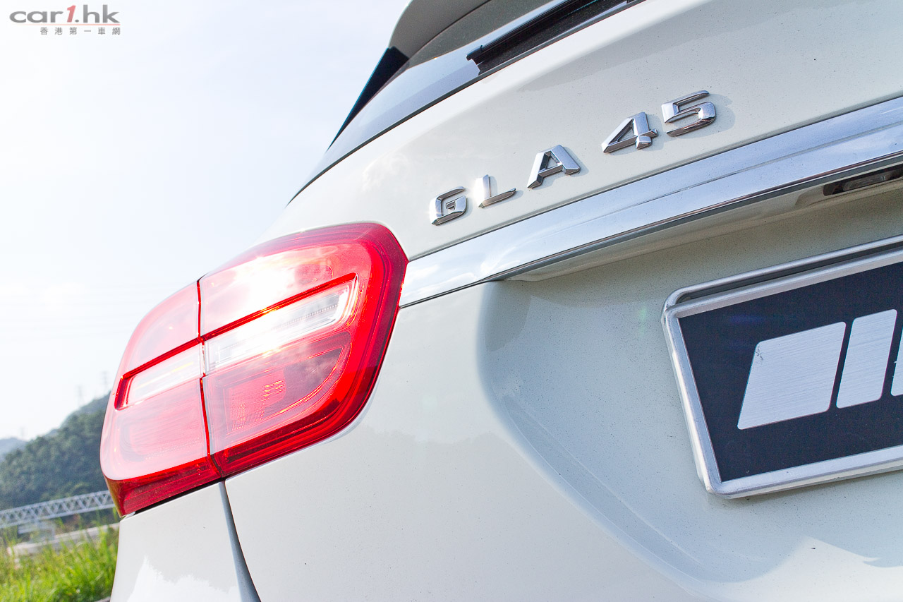 首先「收貨」的,是車子內外「AMG 化」的地方。GLA 除了坐姿稍高外, 那 T 字形錶板、5 個圓形冷氣出風口和懸浮式中控台顯示屏的錶板設計,與 A 和 CLA-Class 沒有分別,而 AMG 版本的它則有碳纖錶板飾塊、Recaro 跑車前座、座椅和軚盤有紅色縫線、紅色安全帶、會發光的「AMG」門檻牌、波棍頭壓有 AMG 盾徽等,與 A 和 CLA 的 AMG 手法一樣。車的外貌亦如是,其頭泵把、裙腳和尾 diffuser 亦有碳纖紋裝飾,排氣喉改為四個方形,紅色制動卡鉗,20 吋輪圈;作為 SUV 的它,GLA 本身有車頂行李架路軌,尾箱邊有保護片,AMG 後也保持一樣;而與四門 CLA 一樣的兩條車頭冚凸起「powerdomes」摺紋,GLA 45 也有。