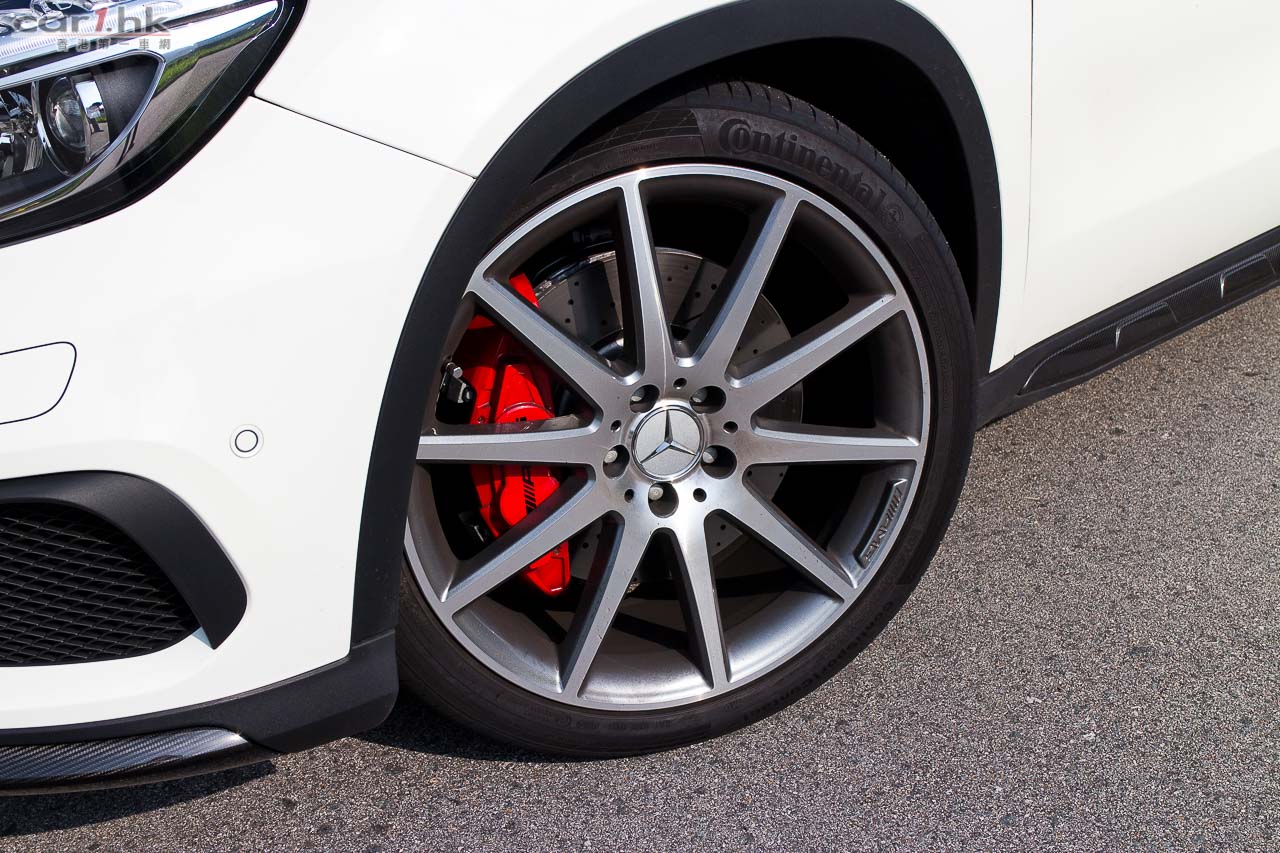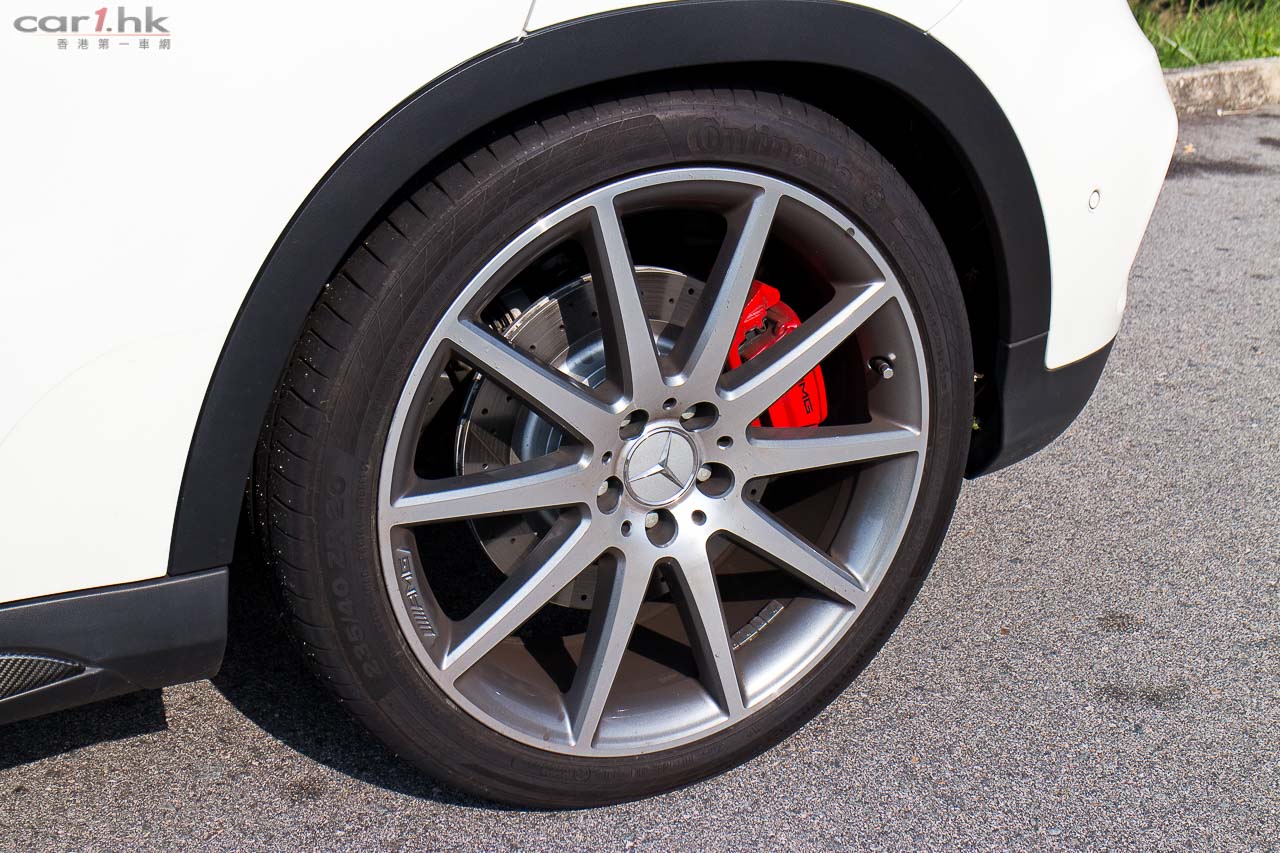AMG 版本有紅色制動卡鉗,20 吋輪圈;之前試的 GLA 250,用 Continental Cross Contact 可越野輪胎,GLA 45 用ContiSportContact 5P。