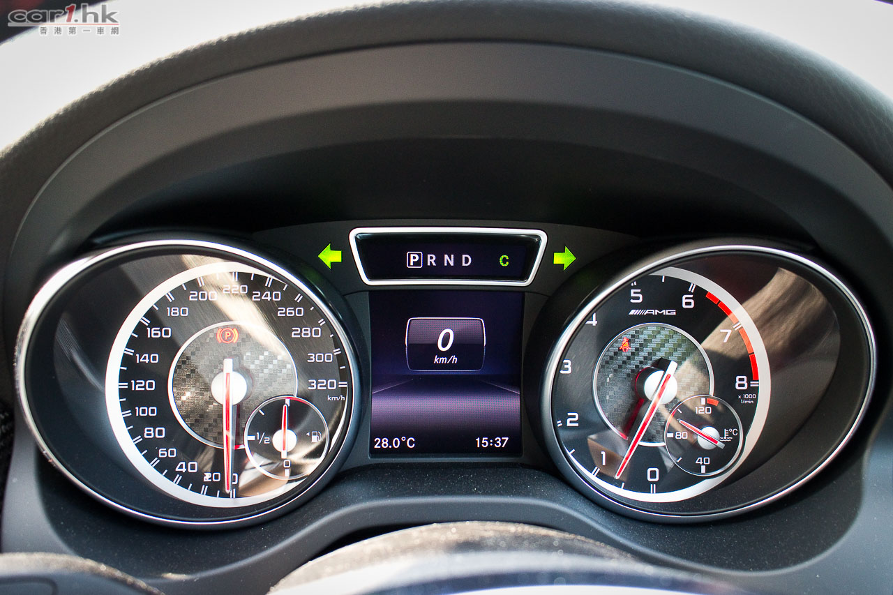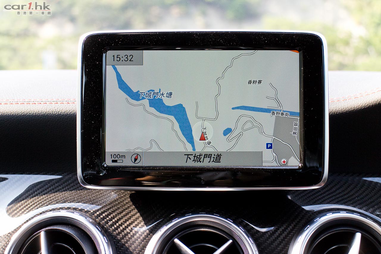 平治認為 GLA 45 的用家不會作越野駕駛,所以錶板上找不到 off-road driving mode 和 DSR 自動控速落山這兩個按鈕,中控台顯示屏亦沒有了由柏油路變成泥地的背景,也沒有傾側角度顯示。