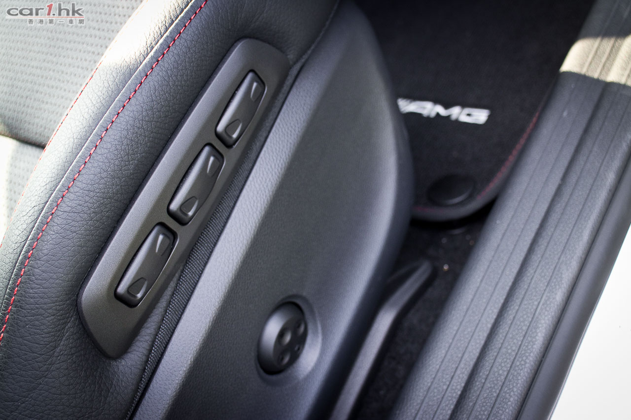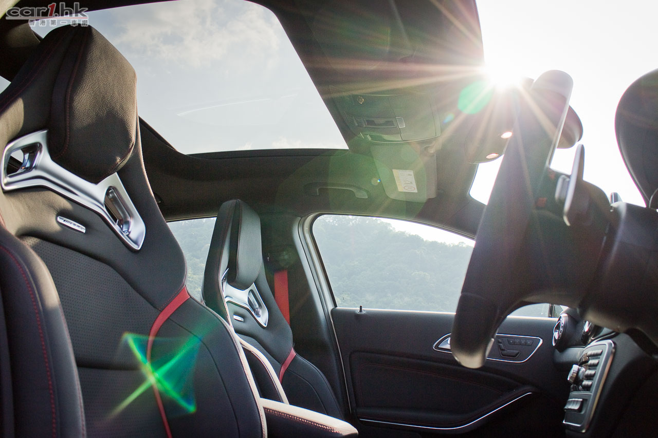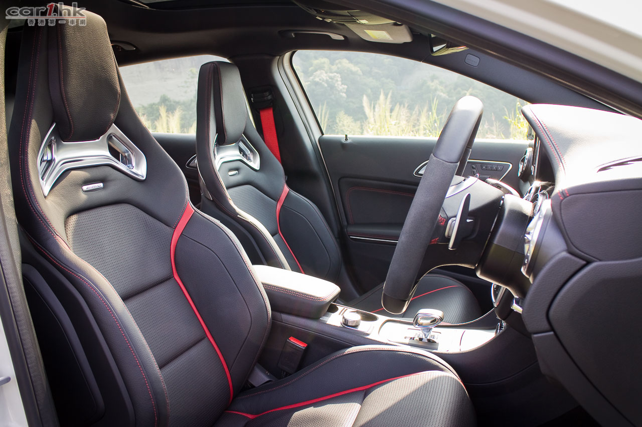 Recaro 跑車前座和紅色安全帶等與 A 和 CLA 45 一樣,波棍頭亦壓有 AMG 盾徽。