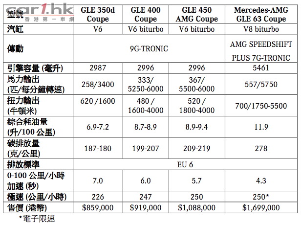 主頁新聞中心 Mercedes-Benz GLE 及 GLE Coupe 售價公開 30/06/2015 FacebookWhatsAppLinkedinLINETwitterEmailCopy URL打印 平治將其暢銷的 SUV 系列推上更高峰。全新平治 GLE 型號的特點包括更具吸引力的車頭及車尾線條,其低廢氣排放及汽車科技成為新典範。此外,平治結合兩款各具獨特風格的系列,設計出全新的平治 GLE Coupe 型號。這款 SUV 車系提供動感的駕駛體驗,更有奪目吸引的外表。 發布會當天價格尚未公開,今日廠方終於有最新價目表提供。GLE 400 由 $815,744 港元起,柴油版 GLE 350d Coupe 版 $859,000 港元起。其他型號價目如下。 查詢:2895 7339(仁孚行) 更多視像內容請即進入 Car1.hk 視像頻道。 更多視像內容請即進入 Instagram 圖片集頻道。 想第一時間收到 Car1.hk 的最新情報?立即加入我們的 Facebook 吧! TagBenz 平治MERCEDES-BENZ本地新聞汽車資訊重點新聞 分享 FacebookWhatsAppLinkedinLINETwitterEmailCopy URL打印 前一篇文章Mazda2 新一批現貨即將抵港下一篇文章豐田熱賣房車系列本週末屯門市廣場迎夏日 相關內容 跑足 30 萬公里仲精神過你?保時捷獨家揭秘「長壽電池」黑科技 McLaren 750S Project Chromology 用 24K 金與樹脂層疊定義「流動藝術」 平治重新定義造車哲學!深度剖析 Mercedes-Benz Tomorrow XX 計劃 Tesla Model Y Long Range AWD 越來越親民 72 勝的傳奇終章!Honda 正式告別 Red Bull 王朝 F1 引擎格局全面洗牌 日產自動駕駛 2027 迎來「大腦」進化!聯手英國 Wayve 注入 AI 靈魂 最新內容 外地新聞 跑足 30 萬公里仲精神過你?保時捷獨家揭秘「長壽電池」黑科技 外地新聞 McLaren 750S Project Chromology 用 24K 金與樹脂層疊定義「流動藝術」 外地新聞 平治重新定義造車哲學!深度剖析 Mercedes-Benz Tomorrow XX 計劃 裝載更多