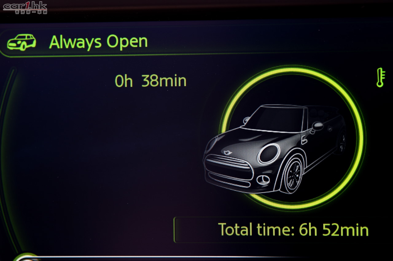 全新MINI Convertible的開篷計時器(Always Open Timer)於中央顯示屏上細緻地記錄開篷的時間,以分鐘為單位,鼓勵開篷駕駛。顯示的MINI車形圖案更會隨著白天、晚上等不同時間或外間氣溫,顯示相應的背景顏色和符號。此外,車主亦可選配全新設計的導風板,輕鬆鎖定於駕駛席和前排客座後方位置,減少開篷駕駛時被不必要的亂流影響。
