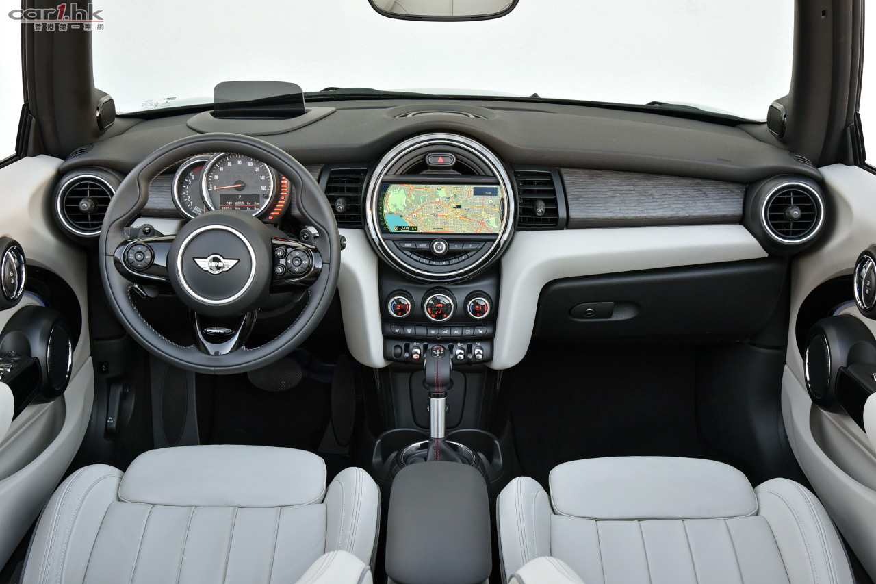 全新MINI Convertible的駕駛艙設計保留了MINI原創風格,但加插了第三代MINI的嶄新元素,增強車廂的現代感及色彩氣氛。重新鋪排的控制台及儀表板為車款的獨有設計,中央顯示屏可配6.5吋MINI Visual Boost多媒體顯示屏,可顯示車輛功能、空調系統、娛樂系統及通訊系統等的操作訊息。伴以LED變色光圈 (LED Ring),隨不同車速及駕駛模式自動轉換顏色,增加駕駛趣味。駕駛席旁的側鏡底部加設額外光源,把MINI標誌投射到地上,配上車廂的MINI Excitement Package,令MINI的獨特風格不言而喻。