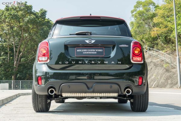 2010 年推出時原是 Mini 首部四門汽車的 Countryman,今代車身比舊款長 20cm,闊多 3cm,前後輪距多 7.5cm,親眼看到時「臣高臣大」的,不很迷你;車身設計重點,有 helmet 頭盔形車頂,越低越闊的啤梨身形,短前後車身外懸,「箭咀」形沙板指揮燈裝飾蓋,尾箱蓋有電動升降和「Easy Opener」腳控感應,SUV 式的地方有黑膠輪拱和裙腳、車頂行李架路軌;頭燈裡的 LED 日行燈,新款 Mini 的是像笑眼的半圓形,Countryman 則是圓形圍繞頭燈一圈;Rebel Green 綠色是 JCW 版的專有車身顏色。JCW Countryman 外形的不同處一如其他 JCW 版本的 Mini,頭泵把較大面積的左右入風口棄除了霧燈,鬼面罩和沙板指揮燈蓋有紅邊,車頂行李架路軌改為黑色,電鍍排器喉咀,車頂尾翼和 19 吋輪圈是 JCW 特有設計,紅色前後制動卡鉗,前的 4 活塞是 Brembo 所製。