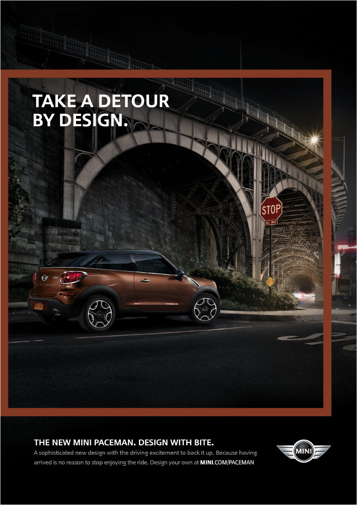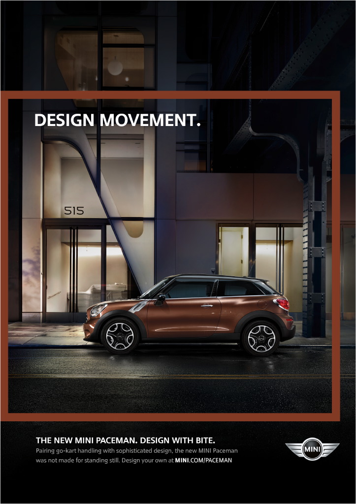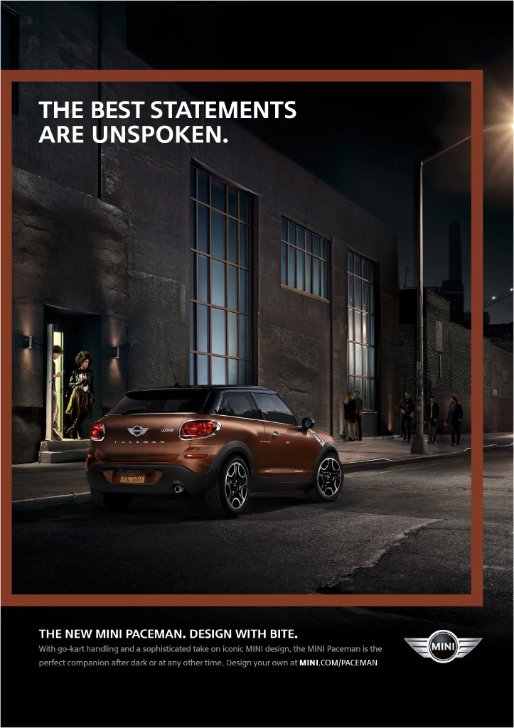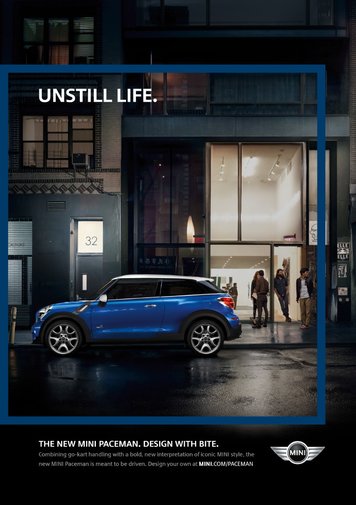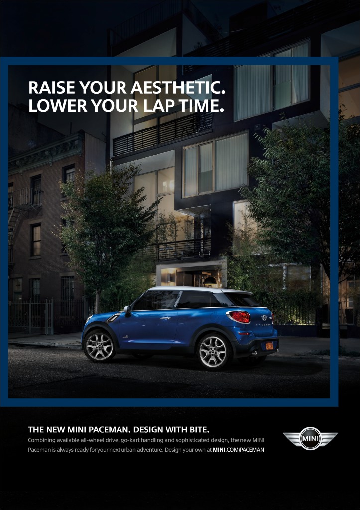 為迎接新款 MINI Paceman 面世,廠方特地製作一系列電視廣告、主題網站、社交媒體及印刷刊物,並安排在 2 月開始陸續在全球市場發放,誓要捕捉全球 Fans 及消費者目光!現時可於 YouTube 的 BMW – MINI 頻道,可以看到以「Street Attitude」為主題、MINI Paceman 怎樣在都市環境盡顯個性。它將會在充滿亞洲風情的小食店前停留,然後穿越大街小巷,並出現在不同背景的城市區域。整輯廣告總共有 3 個版本。另外以 HTML 5 技術編寫而成的 Facebook Page,訪客可透過不同器材連線,於影音環境襯托下體驗 MINI Paceman 各項賣點,以及和世界各地的愛好者一同交流。至於主題網站則以 3D 形式(Magic Eye 技術)展示 MINI Paceman,訪客亦可以親身改裝這部虛擬新車並向好友展示。