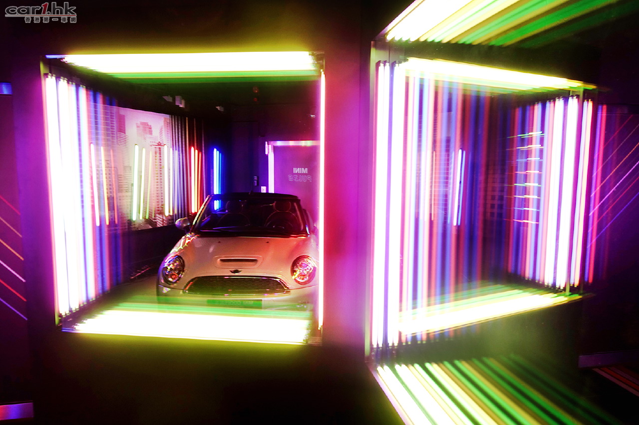 義大利燈光藝術大師Paolo Scirpa由上世紀開始便把他的藝術生涯交織於光影之中,其作品蘊含豐富動人的現代感與科技感,帶來純粹的視覺刺激,為可能只存在於理論上的「Ideal Light」重新作定義。受Scirpa的大作所啟發,【MINI PULZE】也應用近似概念,只使用霓虹光管、木箱及單面反光鏡為主要材料,以視覺元素「霓虹燈光」作為代表繁華城市生命力的鮮明記號,圍繞著暗房中心的MINI Cooper S Cabrio創建出一個錯綜複雜、疑幻似真的模擬環境。這些燈光由車身內精密的行動感應訊號系統所掌控,加上連接至同一複雜電路的現代音樂節拍,一場激發多元感官體驗的車上Neon Jam將一觸即發!