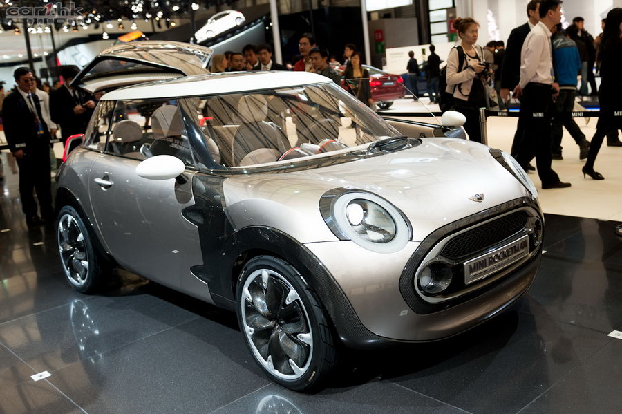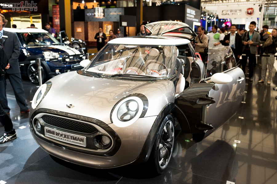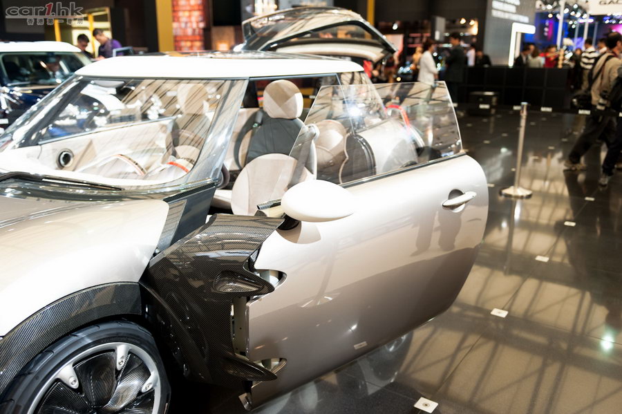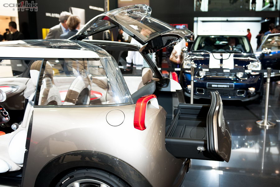 筆者曾經在上海車展開幕前夕,為大家報道了 MINI Rockman 概念車的參展消息(可按此閱讀),而在會場上的真車,大家又可以看得更清楚了。一如之前的資料,「火箭人」的車門確實以類似太空艙的形式開關,而且門鉸部分裝有碳纖裝飾,與輪圈、輪拱、尾箱門及 C 柱等多個地方互相襯托,有助減輕整體重量。至於霓虹管形尾燈、米字旗花紋透明天窗及抽屉式小型車尾箱的設計,一樣在會場上重現出來。