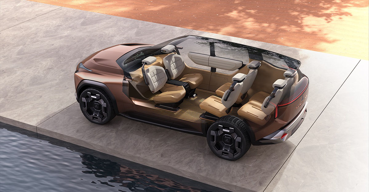 內裝採用一體化「Shell Design」造型,從儀表台延伸至門板與地板,營造出環抱式空間。寬幅液晶顯示螢幕橫跨整個中控,可顯示車輛四周影像與死角視野,協助駕駛在狹窄或越野環境下更安心操控。三排六座布局提供寬敞空間,真皮座椅兼具支撐與舒適性,確保長途旅程依然輕鬆愉快。此外,ELEVANCE Concept 還能 拖掛露營拖車,車內設有廚房與淋浴設備,並可由 PHEV 系統供電,讓戶外冒險變身五星級「行動Glamping」。