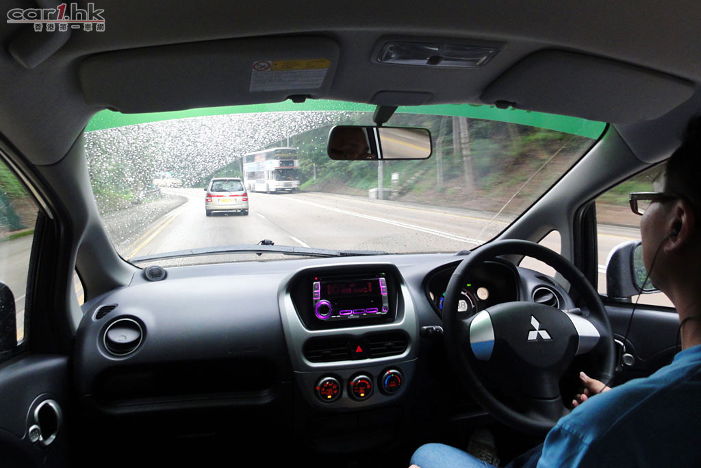 雖然三菱 i MiEV 只有 64 匹馬力,但是走山路卻令筆者更愛它!由九龍三菱 Show Room 出發再由彩虹方向駛入清水灣,沿路大家都知道多彎、上山下斜,i MiEV 全程車廂都是很寧靜,這都是拜摩打驅動帶來的一大好處;如果是同級車走同一條路,上斜時引擎發出的聲浪已經每人煩厭到極點了。上斜寧靜之餘,力水也令筆者驚喜,由於是電動來控制馬達,馬力輸出很線性,比現在的 CVT 波箱配引擎設計,行車時更易感受到線性行車的舒適度!加速度方面很好,在西頁、清水路段等輕微上斜也很輕鬆走到 60km/h 以上。在扭力方面,i MiEV 的最大扭力在 0 – 2,000 轉時已經發揮出來,其 180 牛頓米扭力,比 1,300cc 5 門 5 座小車更強勁,當然比同門師兄汽油版 i 更好( i 汽油版為 94 牛頓米)。