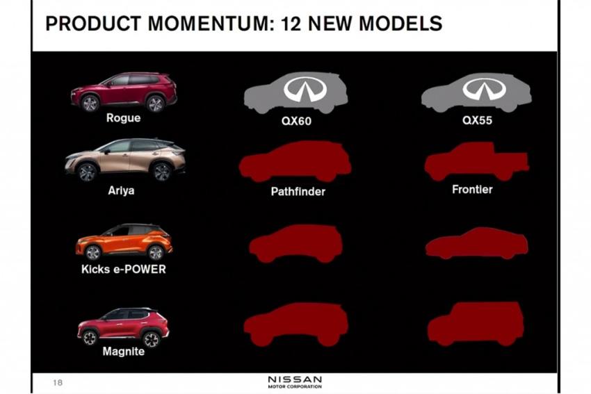 Nissan 在今年 5 月時發佈了一段 A to Z 預告今年將會推出多款新車,日前再發佈了預告圖指今年會推出 12 款新,10 款是 Nissan,2 款 是 Infiniti,如今 Nissan 已經推出了 X-Trail、首款電動 SUV Ariya、小改款 Kicks、小型 SUV Magnite、還有 MPV Pathfinder及 Frontier 貨車尚未推出。Infiniti 已知即將推出的新車是大改款 QX60 與 全新跑旅 QX55。