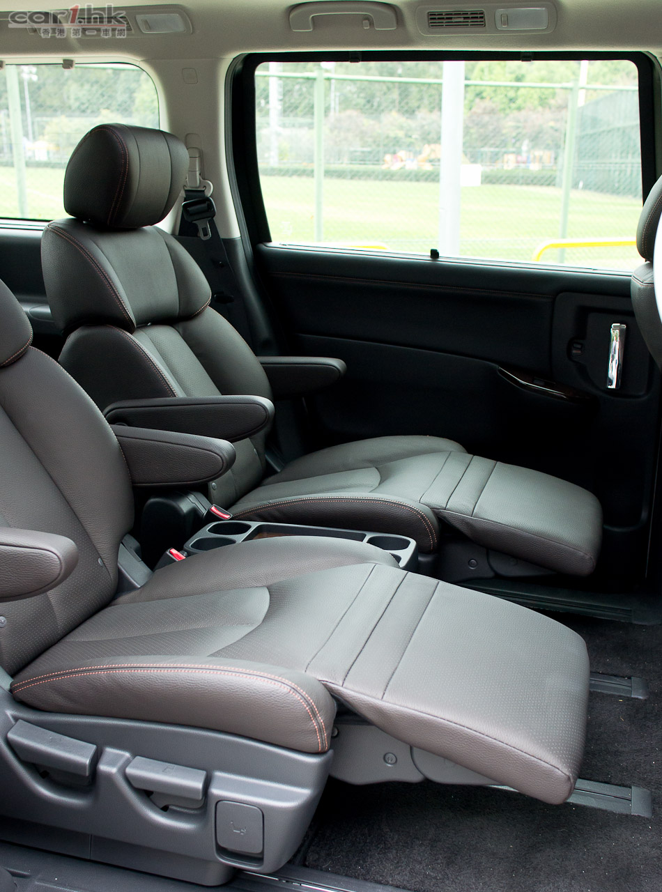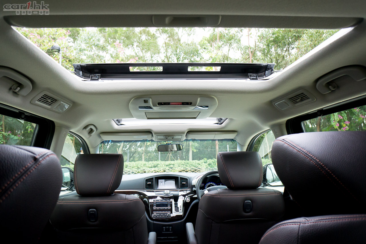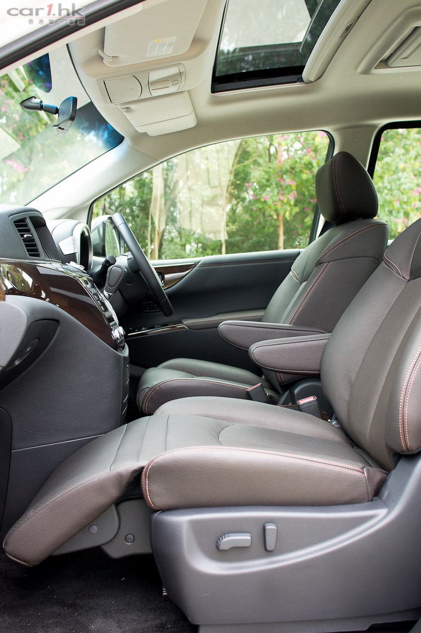 今次試駕的 ELGRAND 屬 Dynamic 版,車頭車尾泵把加入擾流器,同時加裝了裙邊,形態甚為討好。車尾尾門還加入了小尾翼,進一步高調展示 Highway Star 姿態,同時亦令行車更穩定。代理引入的 ELGRAND 2012 版清一色為 VQ35DE 3,500cc 引擎,最大馬力達 280 匹和 344 牛頓米扭力,力水足夠應付此車滿載時所需。波箱方面採用了 Xtronic CVT M-6 半自動 6 前速波箱,再配合 ECO 模式行車可令油耗量更低。官方數字指 ELGRAND 每公升汽油可行 9.4 公里,以現有油價計算大概每公里 $1.75(以日本 10.15 模式行車計算),實在慳油。