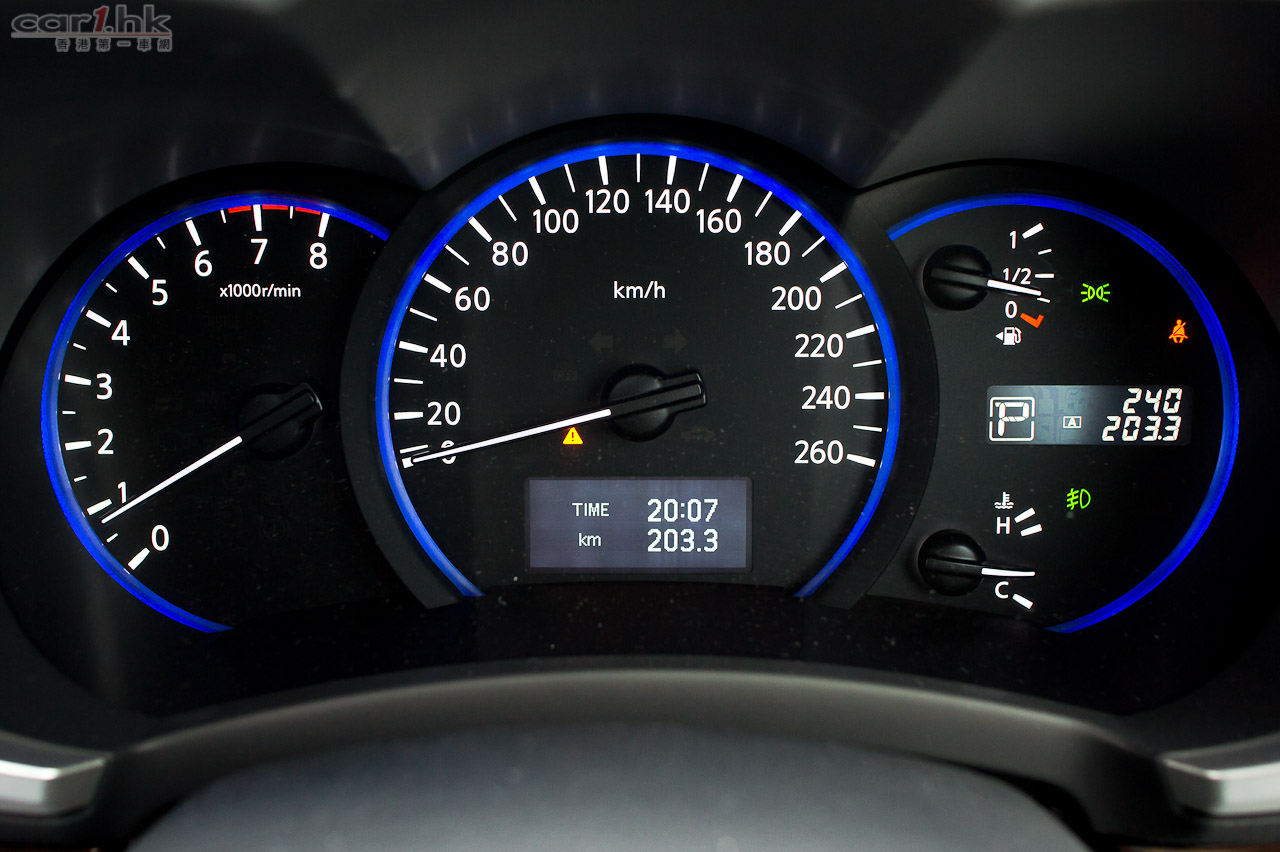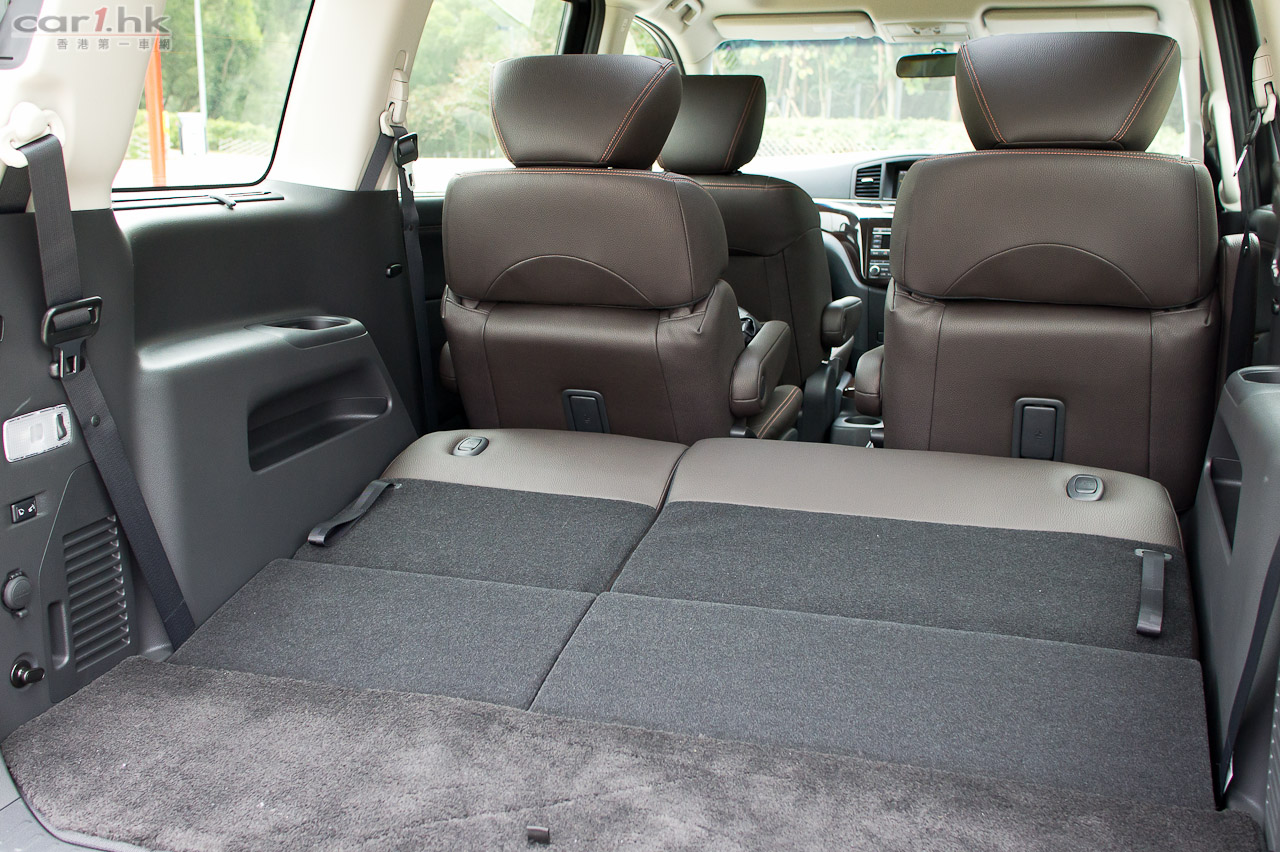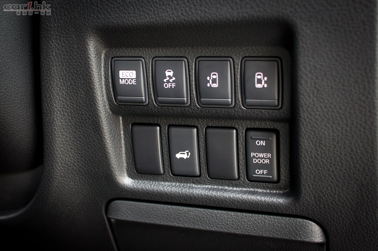 今次試駕的 ELGRAND 屬 Dynamic 版,車頭車尾泵把加入擾流器,同時加裝了裙邊,形態甚為討好。車尾尾門還加入了小尾翼,進一步高調展示 Highway Star 姿態,同時亦令行車更穩定。代理引入的 ELGRAND 2012 版清一色為 VQ35DE 3,500cc 引擎,最大馬力達 280 匹和 344 牛頓米扭力,力水足夠應付此車滿載時所需。波箱方面採用了 Xtronic CVT M-6 半自動 6 前速波箱,再配合 ECO 模式行車可令油耗量更低。官方數字指 ELGRAND 每公升汽油可行 9.4 公里,以現有油價計算大概每公里 $1.75(以日本 10.15 模式行車計算),實在慳油。