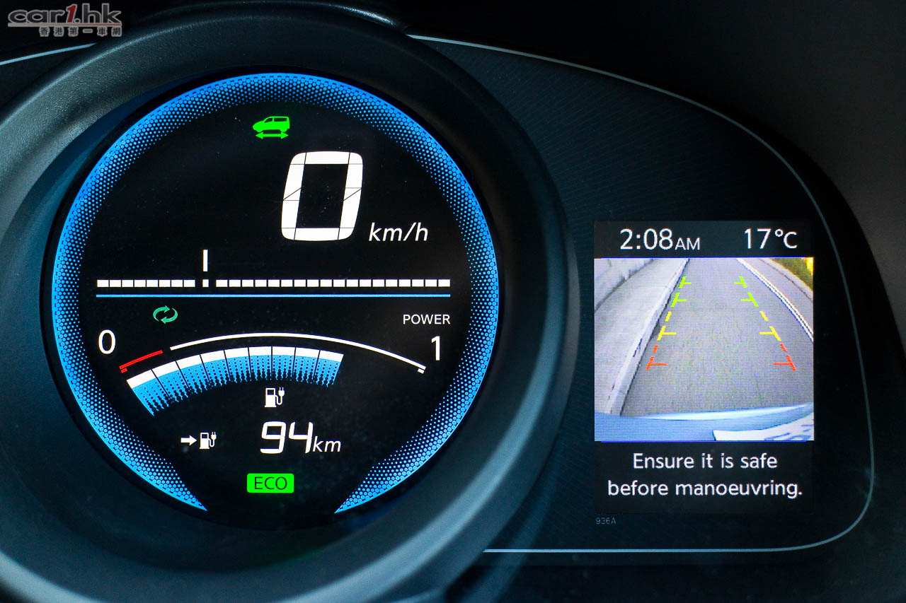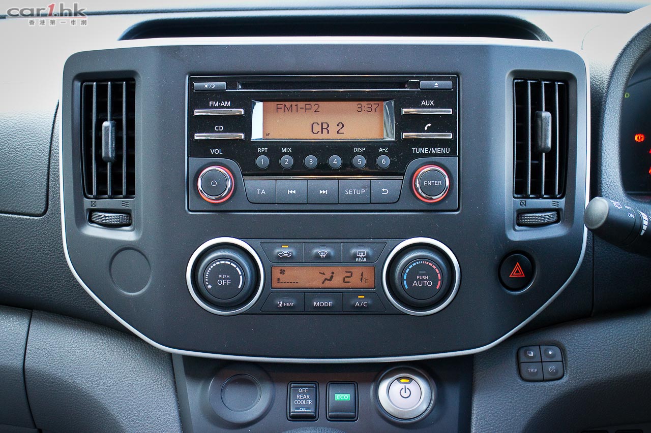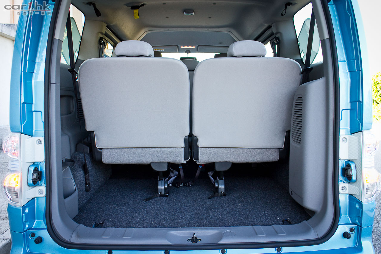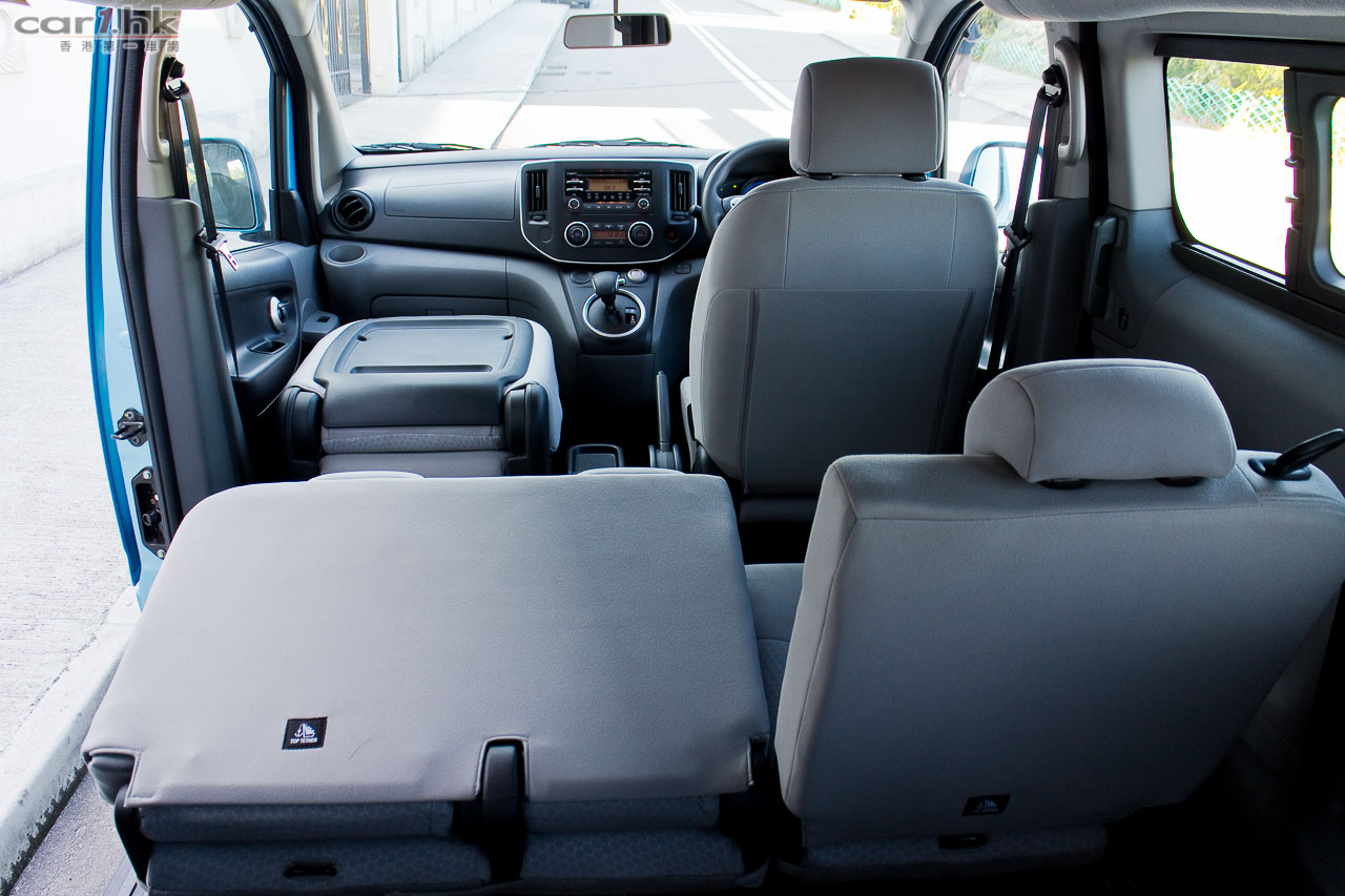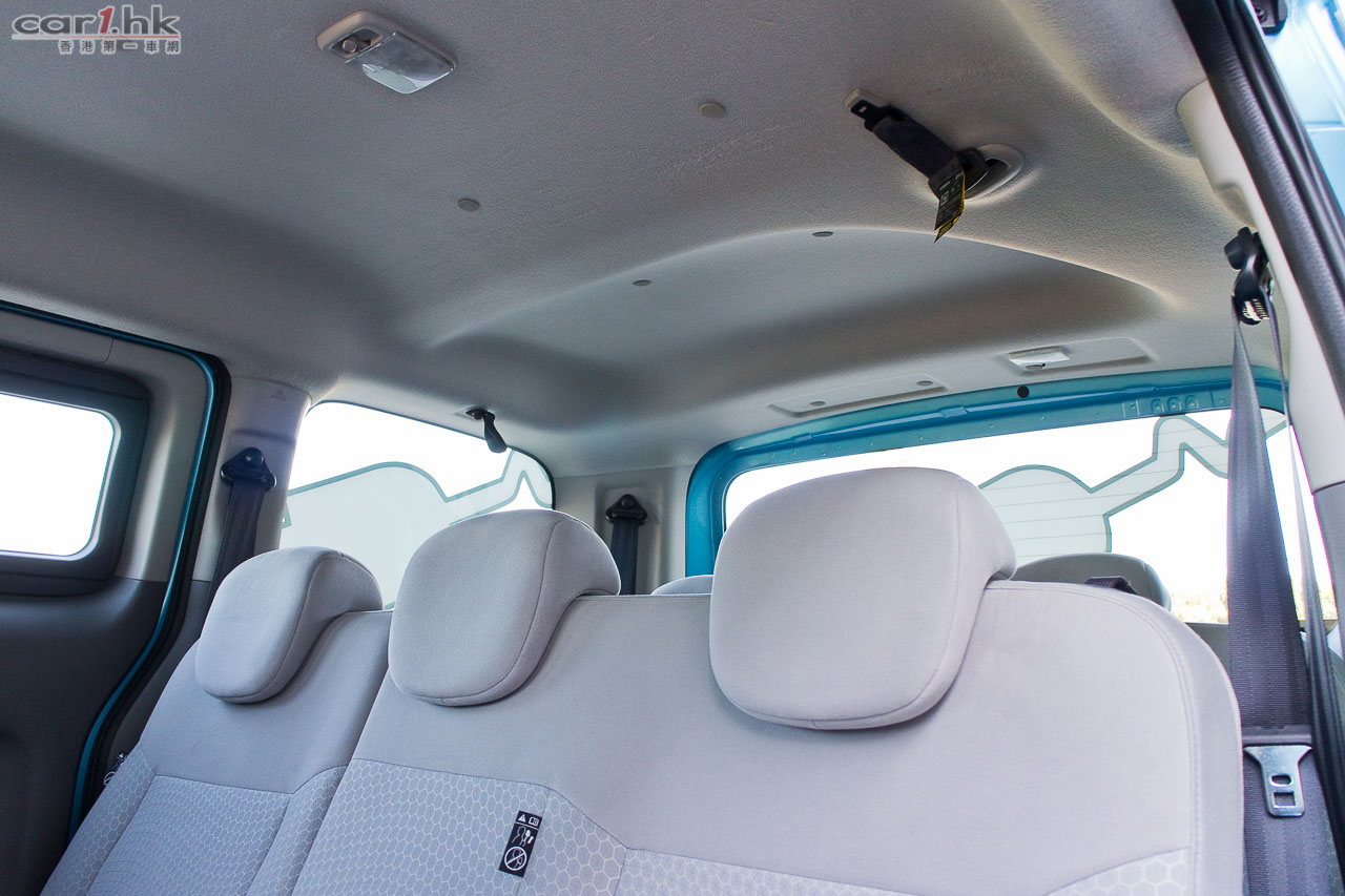 今次代理借出的 eNV200 車身顏色跟五座的私家車 Leaf 一樣是專用淺藍色,Nissan 車章亦是,所以一眼就看得出它的電動車身份。如果想低調一點的話,其實它一樣很多顏色供選擇。如果一時間不習慣一部 MPV 身份的 eNV200 這樣的車身在街上行走太招遙的話,配色上不用擔心的。這部測試車是七座版本,以 2+3+2 座椅分佈,跟一般常見的 MPV 相近,最後排的座椅亦可以像 Serena 般翻起。中排座椅和前排左邊座椅可以將椅背向前摺起,令到這部 eNV200 私家車版本一樣可以放入超長物件。其實心水清的讀者單看它的名字就知道它是由 NV200 轉變而來,所以座位上的空間感絕對不錯。設備方面,雖然沒有雙電趟門,但是 USB 音響、Aux-In、藍牙免題、後泊車鏡頭、安全氣袋、VDC / TCS 行車安全系統等等都有齊。在七座版本中,尾排一樣有冷氣出風口,算是非常貼心沒有偷工減料。