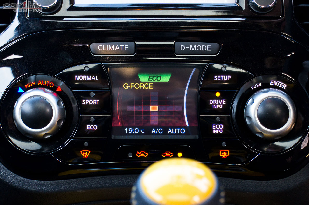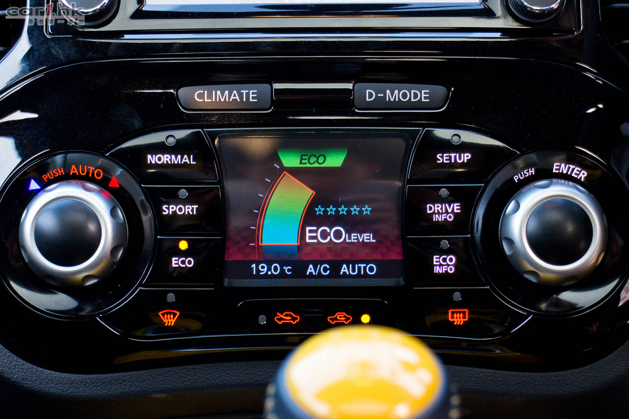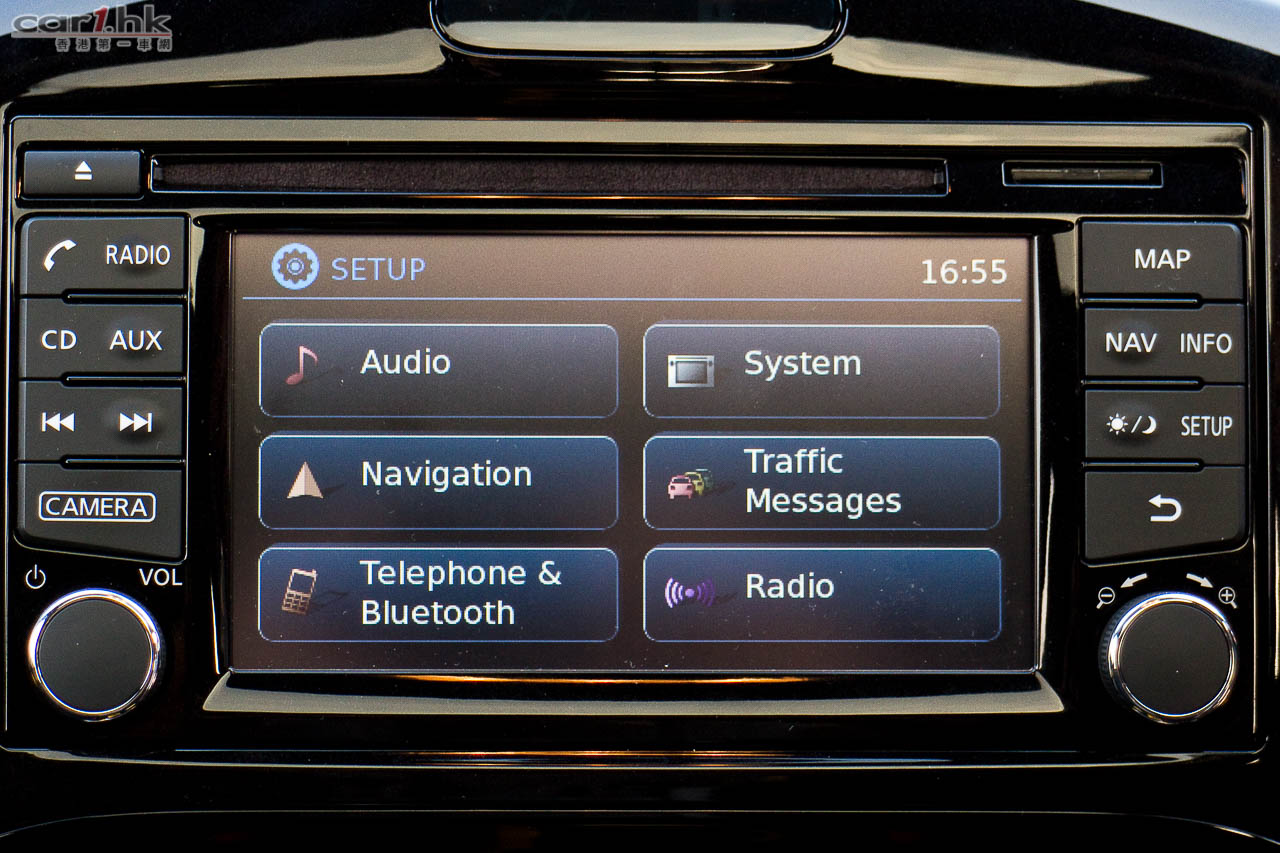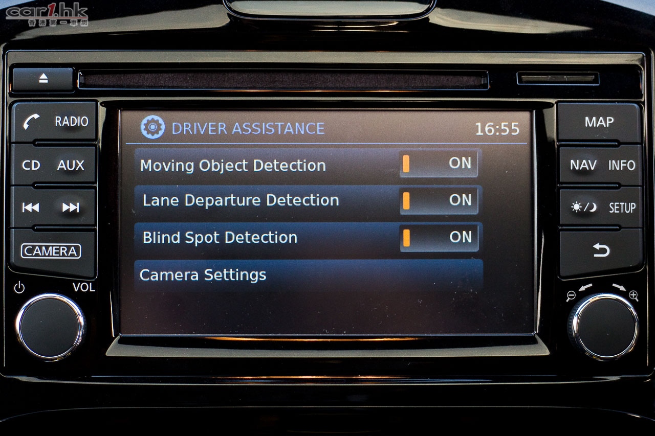 Juke 新加的設備中,車廂裡中控台放音響機頭的位置部份,現改為一個 5.8 吋的輕觸式屏幕,其功能上,音響有 AUX-in 和 USB 輸入,亦可收聽 DAB 數碼電台。新的 MOD 動態探測系統,當察覺車後有移動物體時,會以影像及聲響提示。與其他更豪華的新日產一樣的 AVM (Around View Monitor),憑車外鏡頭將影像組合成 360 度鳥瞰式顯像,大大方便泊車。屏幕之下好玩和美觀的I-CON (Integrated Control System)系統保持不變,按「Climate」顯示空調系統,按「D-Mode」進入Dynamic Control System駕駛反應系統,即可選「Normal」、「Sport」和「ECO」模式去改變軚盤輕重、油門反應和冷氣輸出量。LDW 車道偏離警告,我們在彎路上「劈」彎時忘了刪掉,每踩過對面行車線,系統都「嘟嘟…」作響。BSW 盲點預警,在 A 柱內則設有黃燈,側鏡看不到的盲點有車時,它都會閃起,在眼角中已事先知道有車。新 Juke 在我們試車途中不斷的「嘟嘟…」,「嘟嘟…」,「閃閃…」,「閃閃…」,感覺像是有人從旁監察,驚你出事般,系統頗準確,也很有趣。