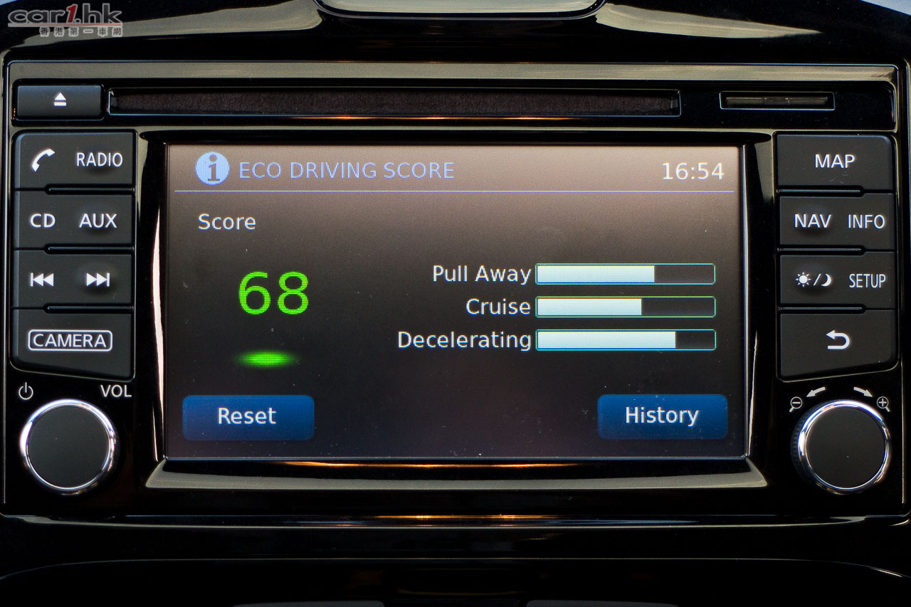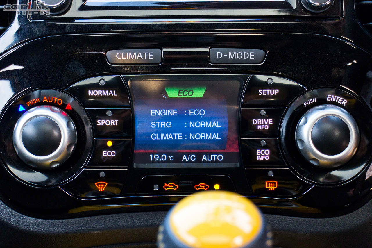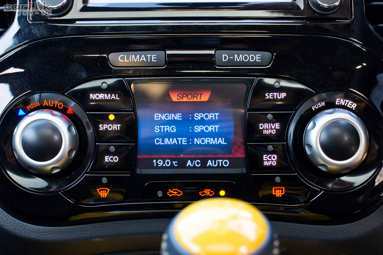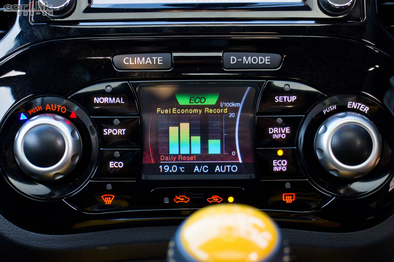 Juke 新加的設備中,車廂裡中控台放音響機頭的位置部份,現改為一個 5.8 吋的輕觸式屏幕,其功能上,音響有 AUX-in 和 USB 輸入,亦可收聽 DAB 數碼電台。新的 MOD 動態探測系統,當察覺車後有移動物體時,會以影像及聲響提示。與其他更豪華的新日產一樣的 AVM (Around View Monitor),憑車外鏡頭將影像組合成 360 度鳥瞰式顯像,大大方便泊車。屏幕之下好玩和美觀的I-CON (Integrated Control System)系統保持不變,按「Climate」顯示空調系統,按「D-Mode」進入Dynamic Control System駕駛反應系統,即可選「Normal」、「Sport」和「ECO」模式去改變軚盤輕重、油門反應和冷氣輸出量。LDW 車道偏離警告,我們在彎路上「劈」彎時忘了刪掉,每踩過對面行車線,系統都「嘟嘟…」作響。BSW 盲點預警,在 A 柱內則設有黃燈,側鏡看不到的盲點有車時,它都會閃起,在眼角中已事先知道有車。新 Juke 在我們試車途中不斷的「嘟嘟…」,「嘟嘟…」,「閃閃…」,「閃閃…」,感覺像是有人從旁監察,驚你出事般,系統頗準確,也很有趣。