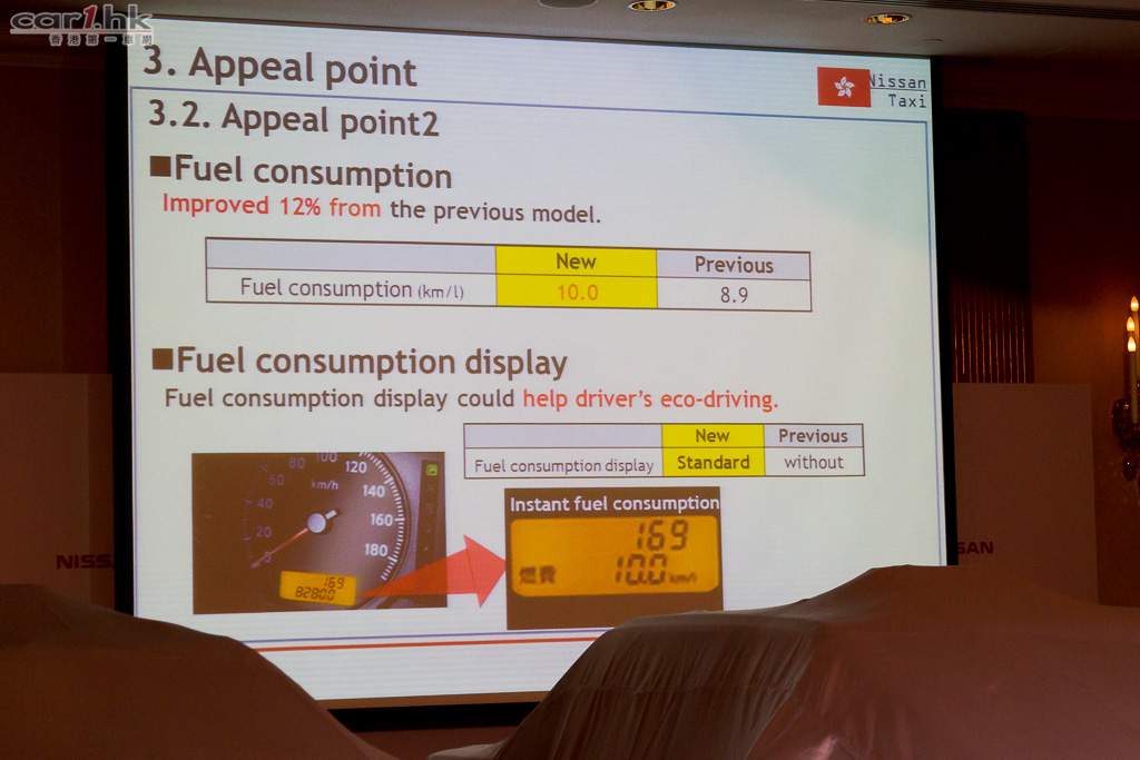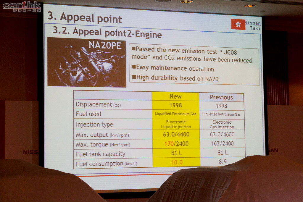 全新直噴引擎令到新一代日產的士扭力更好之餘,燃油耗量亦比上一款低,達到 10km/L。