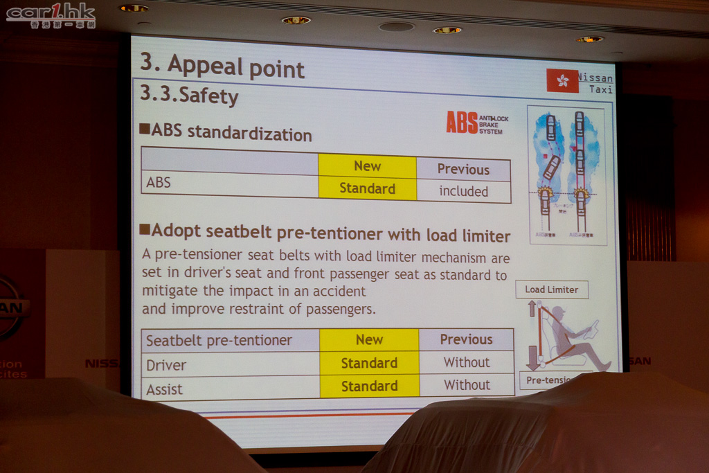 ABS 煞車防鎖死系統已成全新日產的士標準配備,當天雨路滑緊急煞車時,有助減低汽車打滑的機會。