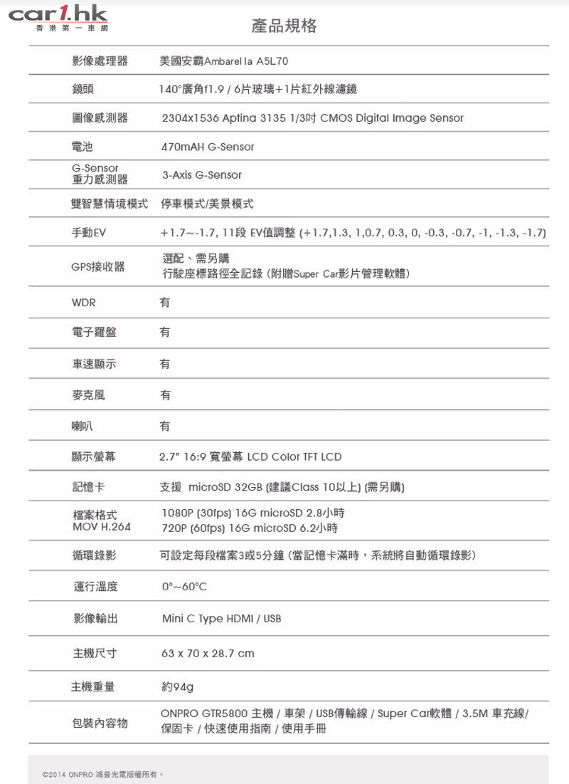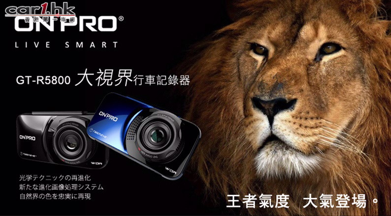一組優異的行車紀錄儀,其中央影像處理晶片佔有非常重要的角色。ONPRO GT-R5800採用美商安霸高階數碼影像機種專用的AMBARELLA A5L70晶片,其528 MHz ARM11處理器提供1080P Full HD H.264 Codec解決方案,可處理240 MPixel/s的專業級影像質素處理(image sensor pipeline),提供優異成像效果。ONPRO GT-R5800內置F1.9 六片玻璃大光圈鏡頭,令影像品質更清晰,也營造更光亮的夜間效果,畫質更優異。此外,140度廣角設計也可令覆蓋範圍更闊。