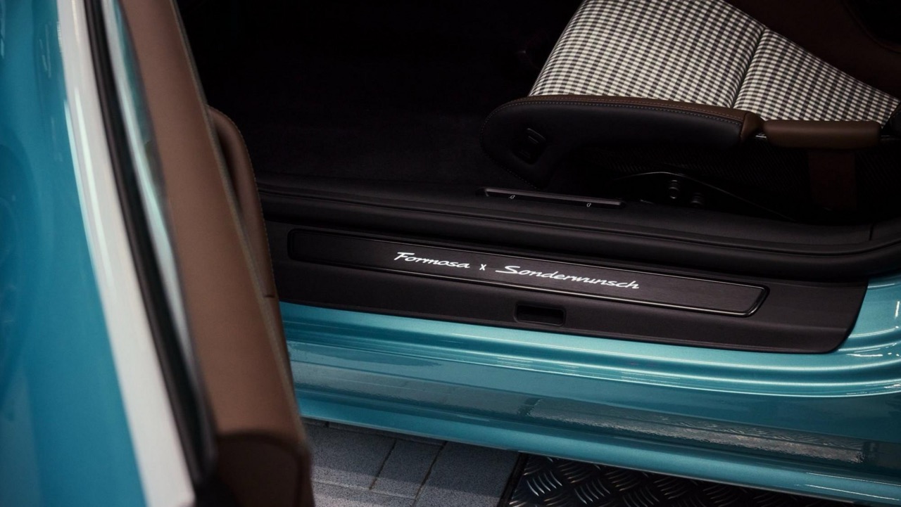 走進車廂,設計團隊將視角從海岸線拉回了台灣中央山脈的蔥鬱森林。內裝大量採用 Paldao 帕爾達奥木紋飾板,這種溫潤的木質紋理,彷彿讓人置身於高海拔的森林之中。座椅是這次內裝的重頭戲,採用了松露棕與黑色的雙色皮革包覆,並輔以「Night Green」夜綠色縫線,質感極佳。最令人驚豔的是 Porsche 首次開發的「Formosa」專屬格紋圖案,由夜綠、黑與奶油白三色交織而成,應用於座椅中央與車門飾板。連平時鮮少人注意的前行李廂,都採用了全皮革包覆並繡上 Formosa 字樣。門檻飾板發光的「Formosa x Sonderwunsch」字樣,以及頭枕上結合 911 輪廓與山海意象的壓印徽飾,每一個細節都在訴說著這座島嶼的故事。