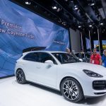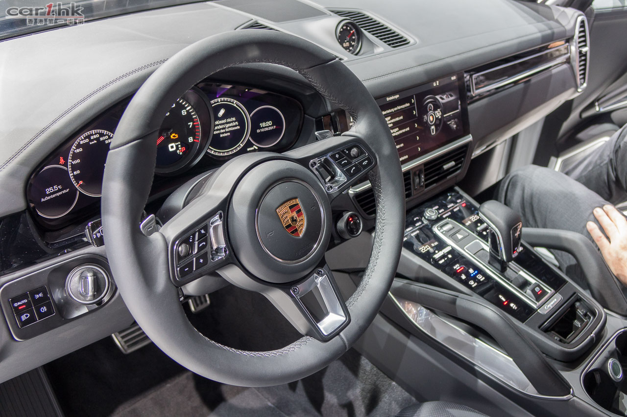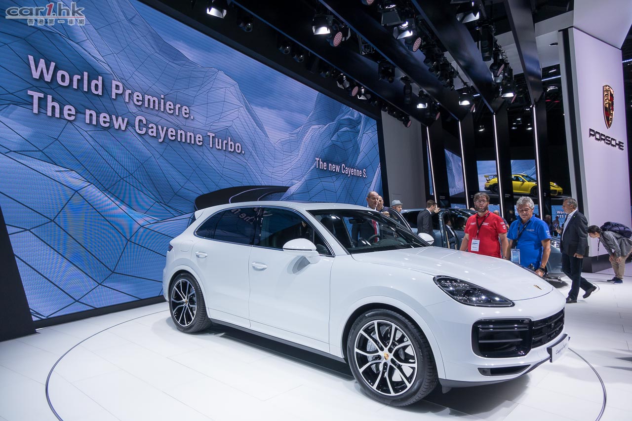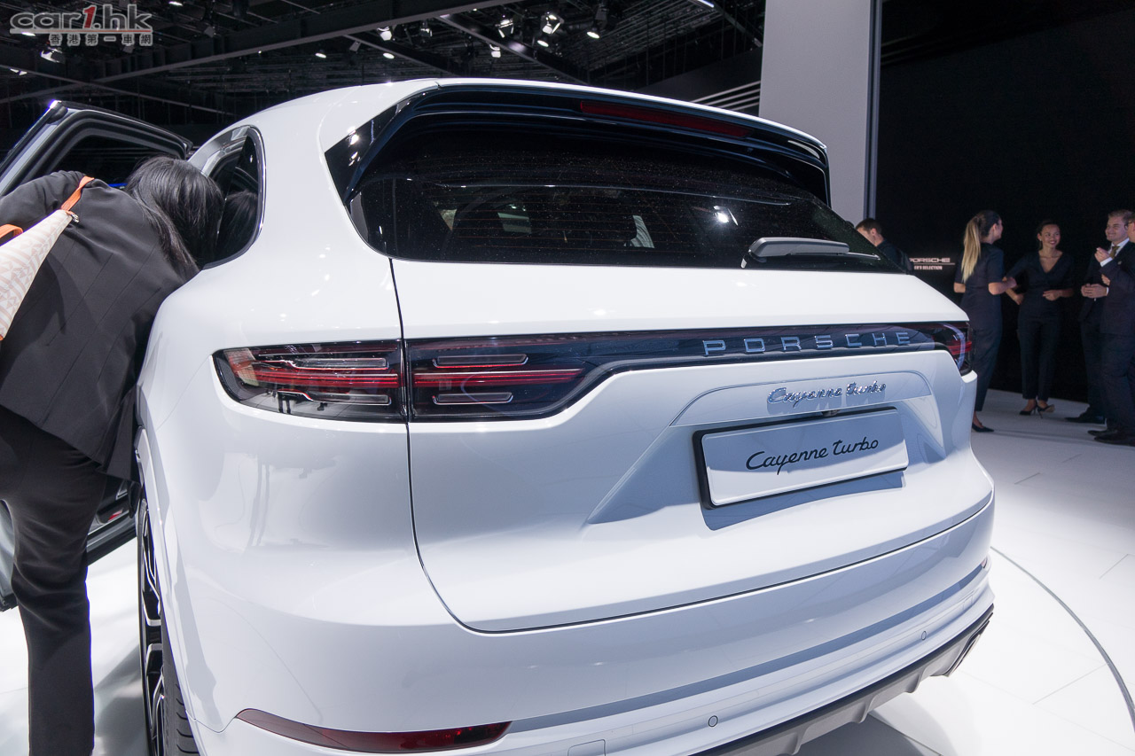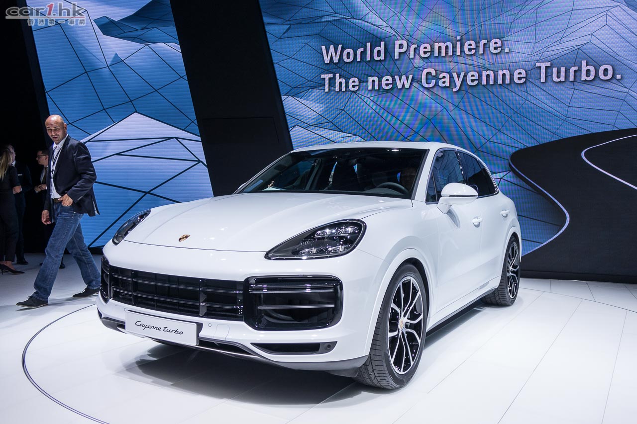 Porsche Cayenne 最強性能 Turbo 車型現身法蘭克福車展!外觀方面,頭泵把的氣壩造型經過重新設計,車尾頂部更有 SUV車款首見的電動尾翼,在高速行駛時增強下壓力,而且在緊急煞車時可利用空氣阻力加強煞車效能,據了解在時速 250km/h 時緊急煞車可以縮短 2 米煞車距離。身為旗艦版本,Cayenne Turbo 車廂配備了最頂級裝備,七吋液晶顯示儀錶版、新一代 PCM 的高清 12.3 吋觸控螢幕、高達 710 瓦的 Bose 音響及 18 項電動調整及電熱的前排座椅等等,彰顯頂及版的不凡身分。使用全新設計輕量化底盤,配備了最新「三氣室」氣壓懸掛能夠自動調整及模擬不同彈簧和有 6 種高度選擇,再配合主動減震系統及與 PASM 主動懸掛調整功能,能夠應付不同的駕駛環境。同時, Cayenne 大改款推出的後軸轉向系統成為標準配備,加上 PDCC 電子防傾系統及 PTV+ 扭力導引升級系統,令 Cayenne Turbo 的操控性更如虎添翼。動力系統方面採用 4.0 公升 V8 雙渦輪增壓引擎,可爆發 550 匹馬力及高達 770 牛頓米扭力,比上代進步了 30 匹及 20 牛頓米扭力,由靜止加速至 100km/h 只需 4.1 秒;如果選擇升級至跑車計時套件將會配備彈射起步模式,0-100km/h 可以再快 0.2 秒,極速更達 286km/h。