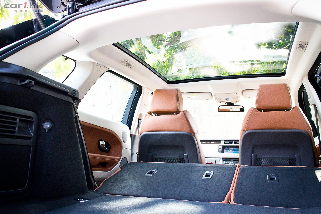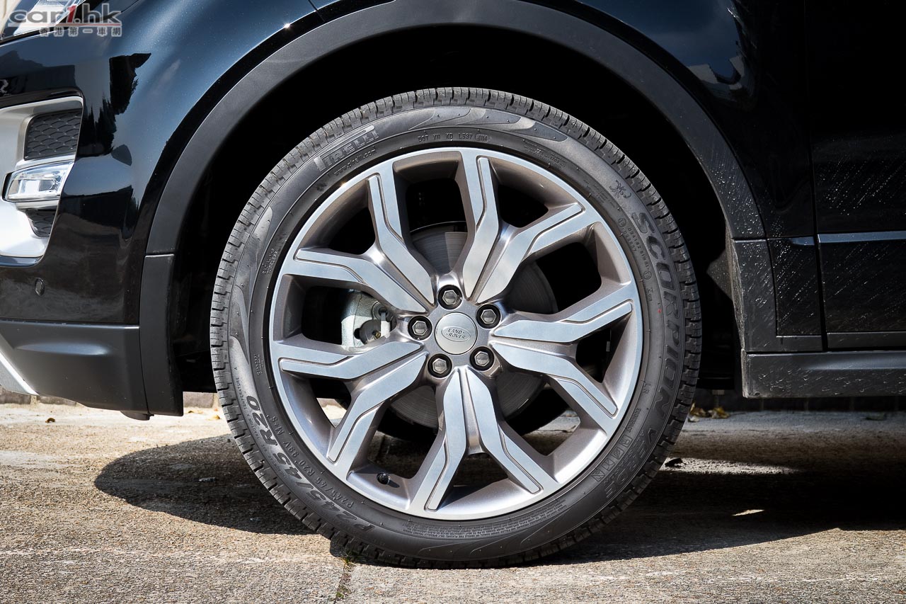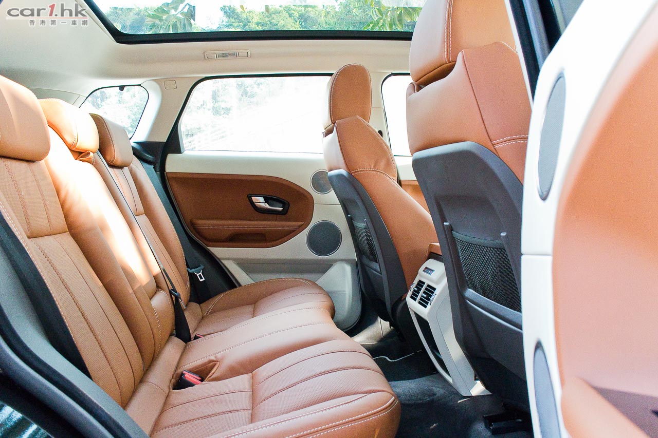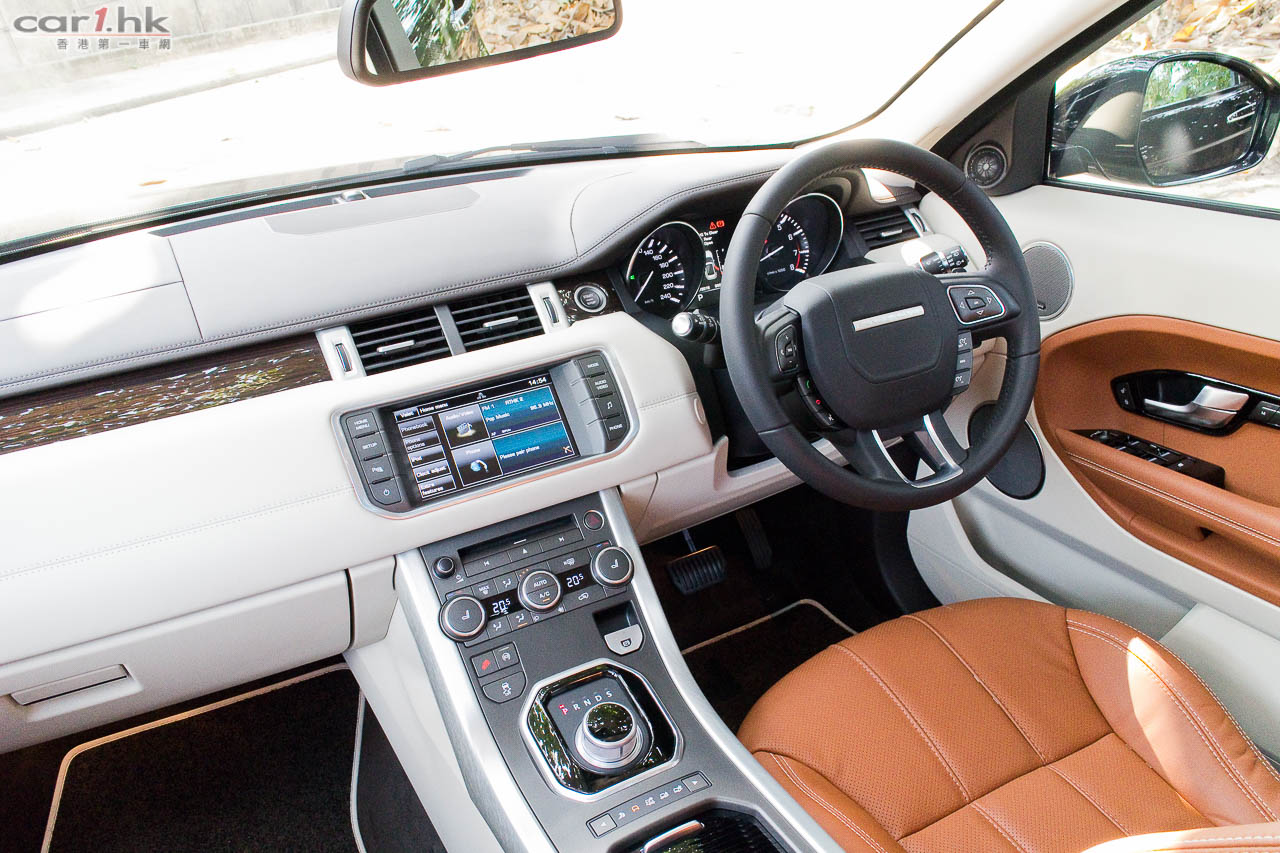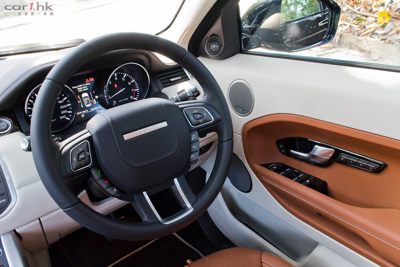 Autobiography 暫時是 Evoque 最豪的版本,試駕車以黑色為主,內裝側以光鮮啡加杏色作配襯,令到這部車內外對比強烈。不過令到它外觀型格,內在有溫暖的感覺,相信較年輕的車主會很喜歡。車身沙板、尾門貼上 Autobiography 標誌以示身份。全車四周都安裝了鏡頭,可提供 360 度環視拍攝,方便泊車外,亦令越野行車時更易看到路面環境。輪圈換上了專屬 20 吋五幅 Y 型鍛造版本。前後泵把都是霧面銀色,霧燈亦有銀框包圍住,在外觀方面大大提升了 Evoque 的層次感。