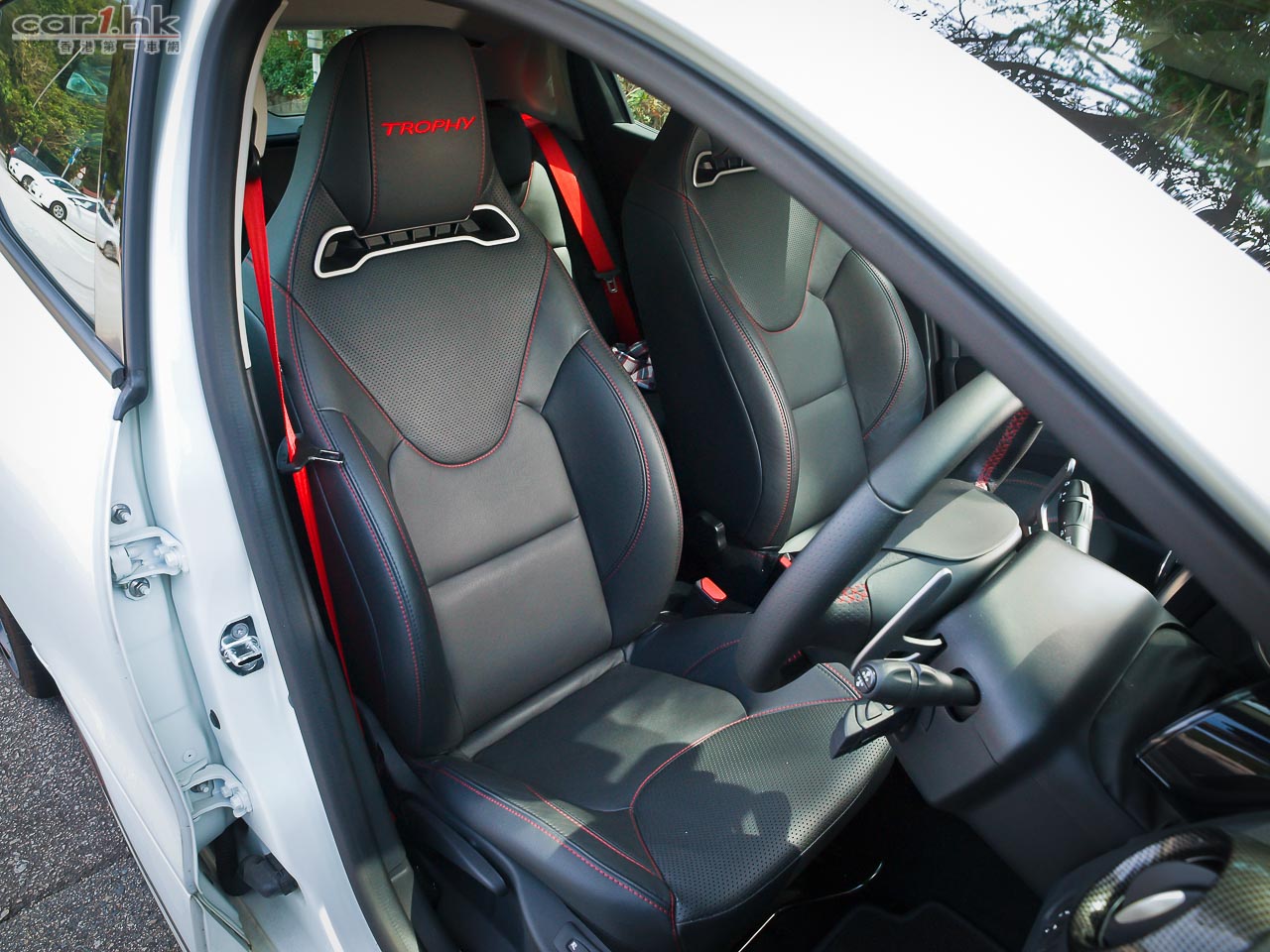 有紅色「TROPHY」銹字的連頭枕的前座,弧度與 R.S. 200 一樣,即都是微微兜髀,微微夾腰;橙紅色的安全帶、座位和軚盤縫線一樣。