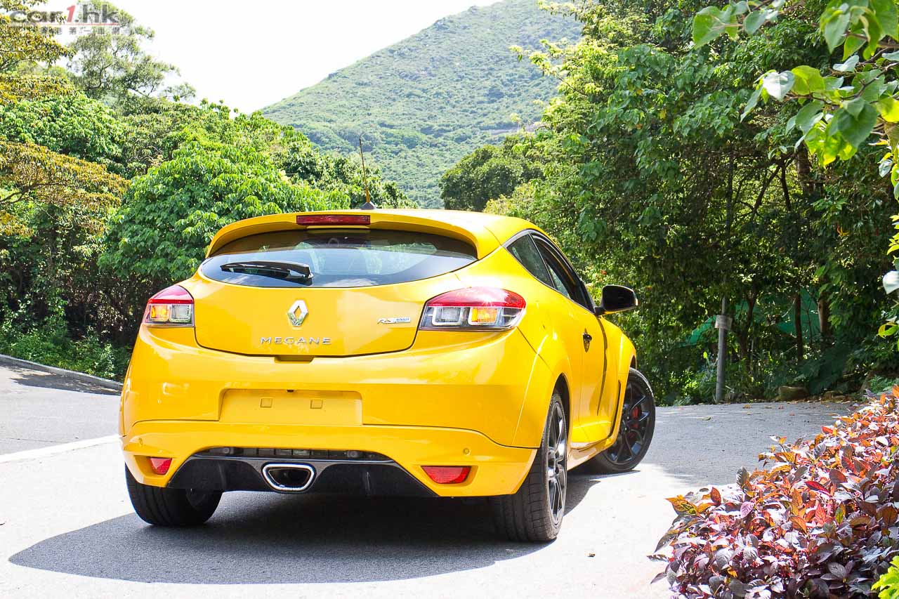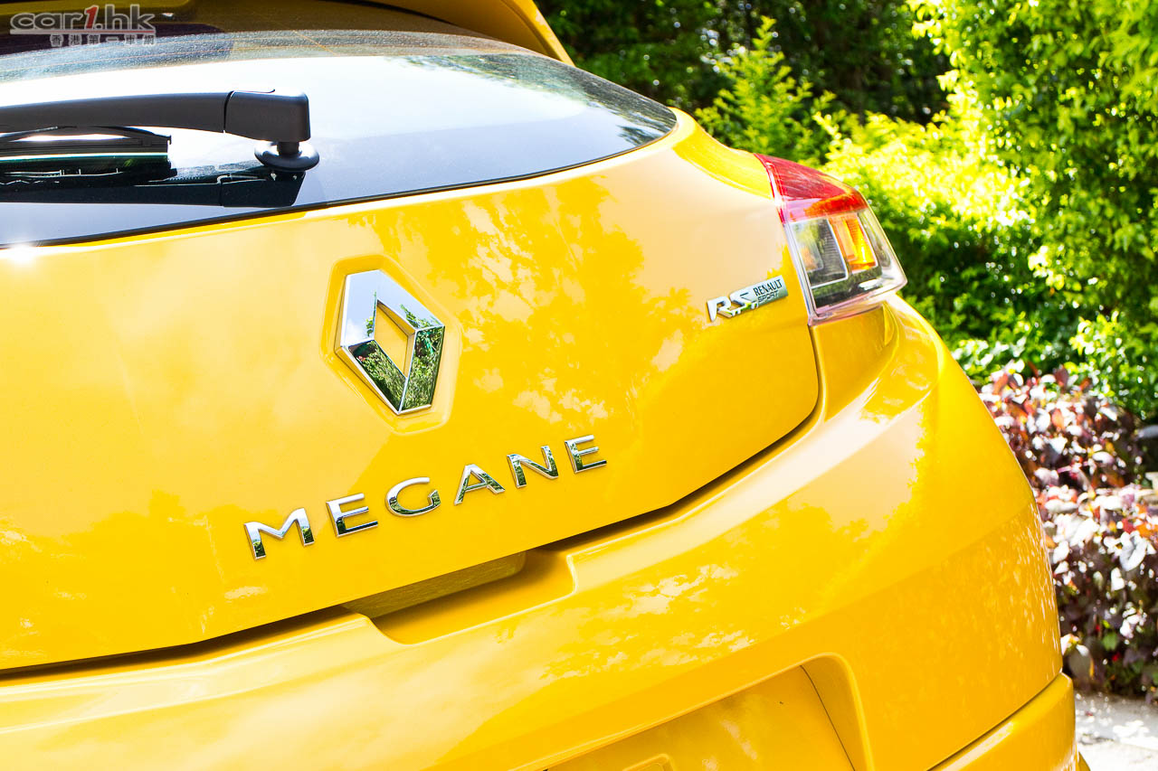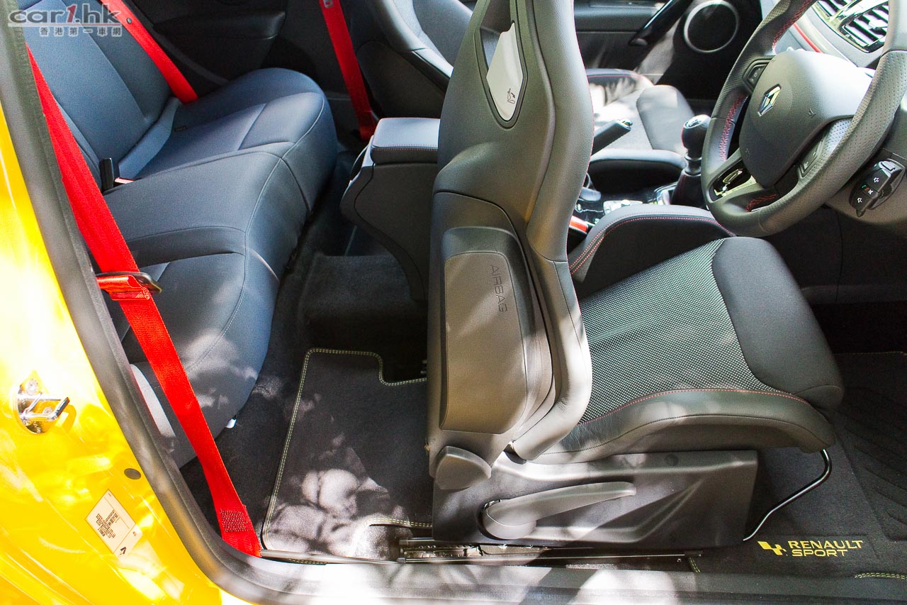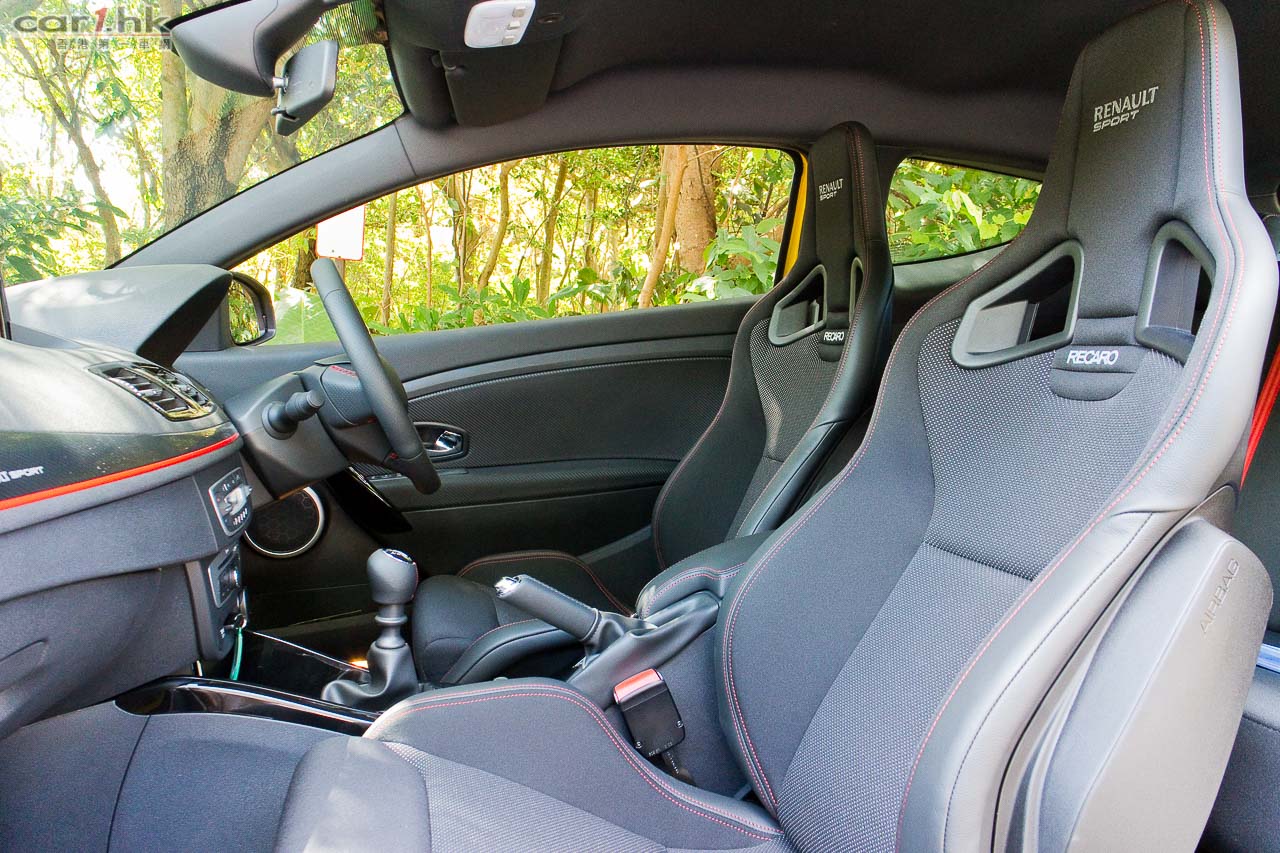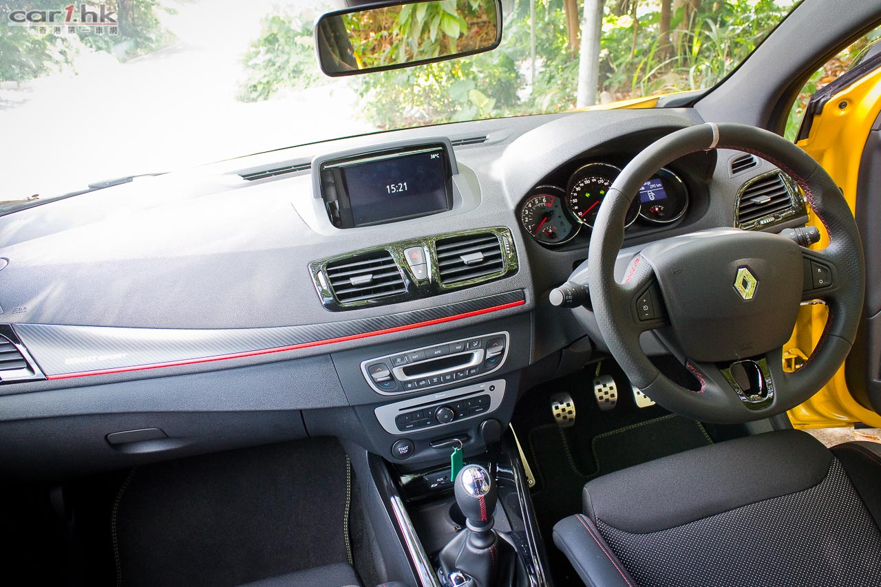 車廂裡,同形狀的 Recaro 座椅,皮革/纖維布混合,貼身的側墊和角度向上的椅墊,既夾腰又兜大腿,賽車感覺強,落場駕駛能提供很好的承托力,但日常用,長久並不很舒適。舊款車廂見到的黃色安全帶、波棍和軚盤黃色縫線,這部變為紅色。R.S. 獨有的軚盤 12 點「回中」縫線、鋁質腳踏、碳灰色扮碳纖維花的錶板飾塊、椅背和錶板等地方上的「Renault Sport」Logos 一樣;還有是那接合得極快的離合器,極難吊 clutch 和控制得順暢,起步死火是常事,但起行後索性彈clutch轉波,能提供極快捷的接合反應。難於 heel-and-toe 的腳踏位置,當然維持一樣。唯一不同的,是錶板上的 R.S. Monitor 顯示屏,舊款像是隧道入口的小盒蓋,新款改用像是 tablet 平板電腦的 touchscreen 彩色顯示,除馬力、扭力輸出、turbo 壓力、油門角度、進氣溫度、機油溫度、G-force 錶、Lap times 圈速計時、0–100km/h 和 0–400M 加速計時等原有功能(但有更似打機的圖像)外,R-Link 功能有 TomTom 衛星導航、多媒體控制和免提電話等。新年度的 Megane R.S 售價 $385,000,$40 萬樓下的,很難想到有甚麼高性能類別汽車有比得上它的加速性能、操控樂趣、一見難忘的外形和不算易開的挑戰性。