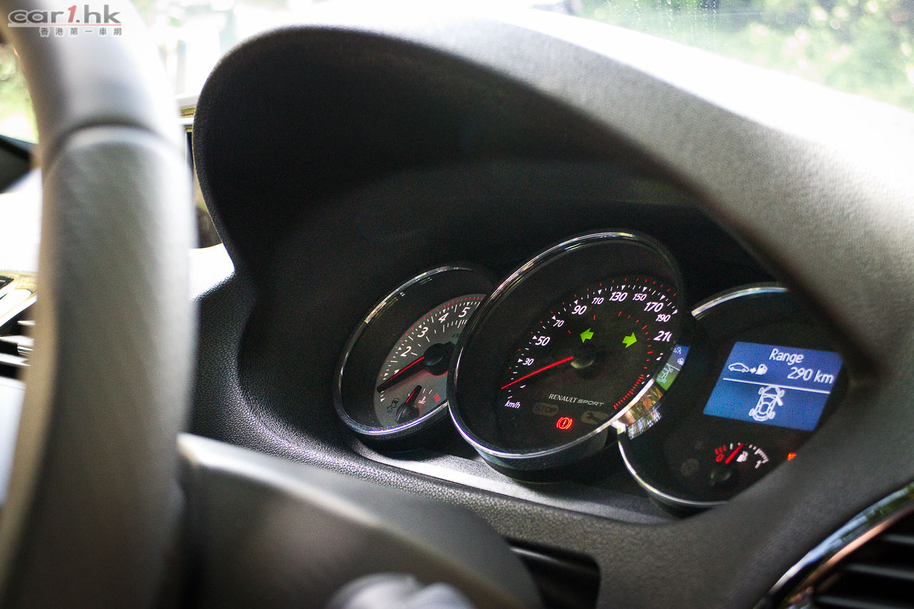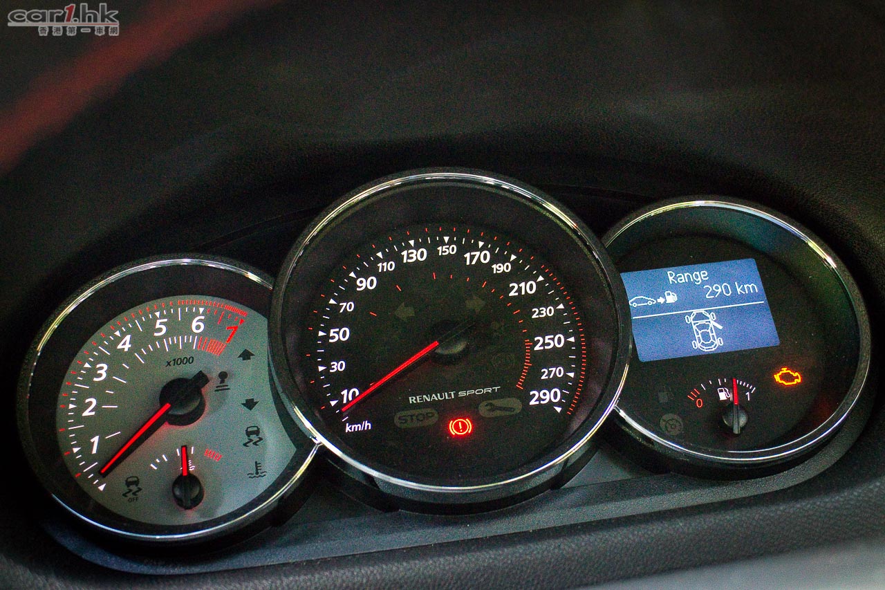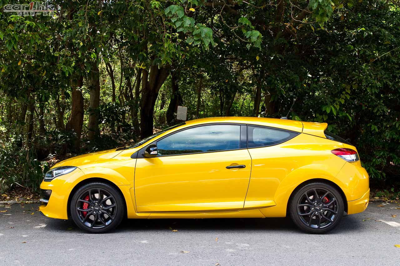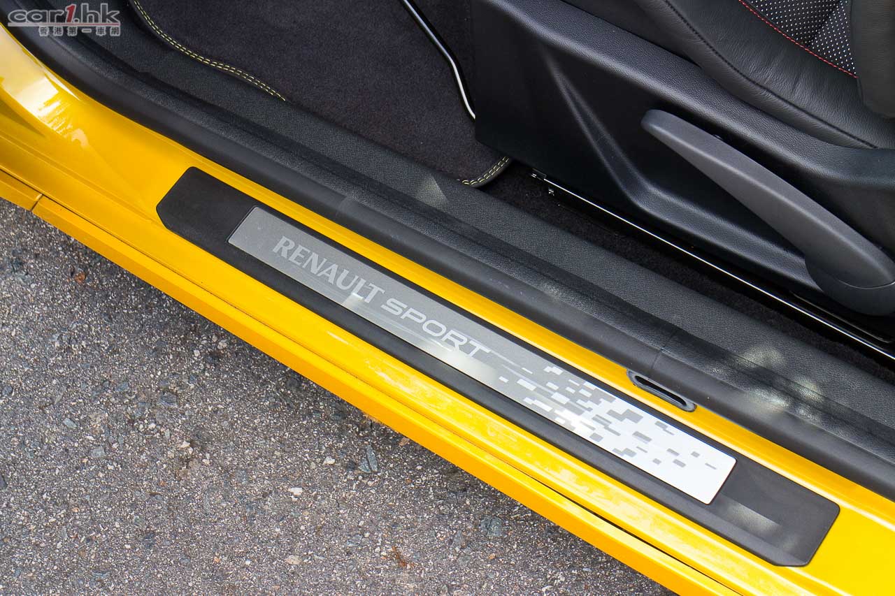 車廂裡,同形狀的 Recaro 座椅,皮革/纖維布混合,貼身的側墊和角度向上的椅墊,既夾腰又兜大腿,賽車感覺強,落場駕駛能提供很好的承托力,但日常用,長久並不很舒適。舊款車廂見到的黃色安全帶、波棍和軚盤黃色縫線,這部變為紅色。R.S. 獨有的軚盤 12 點「回中」縫線、鋁質腳踏、碳灰色扮碳纖維花的錶板飾塊、椅背和錶板等地方上的「Renault Sport」Logos 一樣;還有是那接合得極快的離合器,極難吊 clutch 和控制得順暢,起步死火是常事,但起行後索性彈clutch轉波,能提供極快捷的接合反應。難於 heel-and-toe 的腳踏位置,當然維持一樣。唯一不同的,是錶板上的 R.S. Monitor 顯示屏,舊款像是隧道入口的小盒蓋,新款改用像是 tablet 平板電腦的 touchscreen 彩色顯示,除馬力、扭力輸出、turbo 壓力、油門角度、進氣溫度、機油溫度、G-force 錶、Lap times 圈速計時、0–100km/h 和 0–400M 加速計時等原有功能(但有更似打機的圖像)外,R-Link 功能有 TomTom 衛星導航、多媒體控制和免提電話等。新年度的 Megane R.S 售價 $385,000,$40 萬樓下的,很難想到有甚麼高性能類別汽車有比得上它的加速性能、操控樂趣、一見難忘的外形和不算易開的挑戰性。