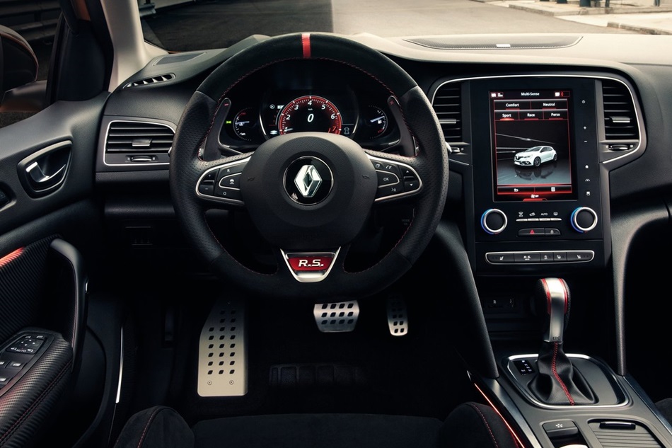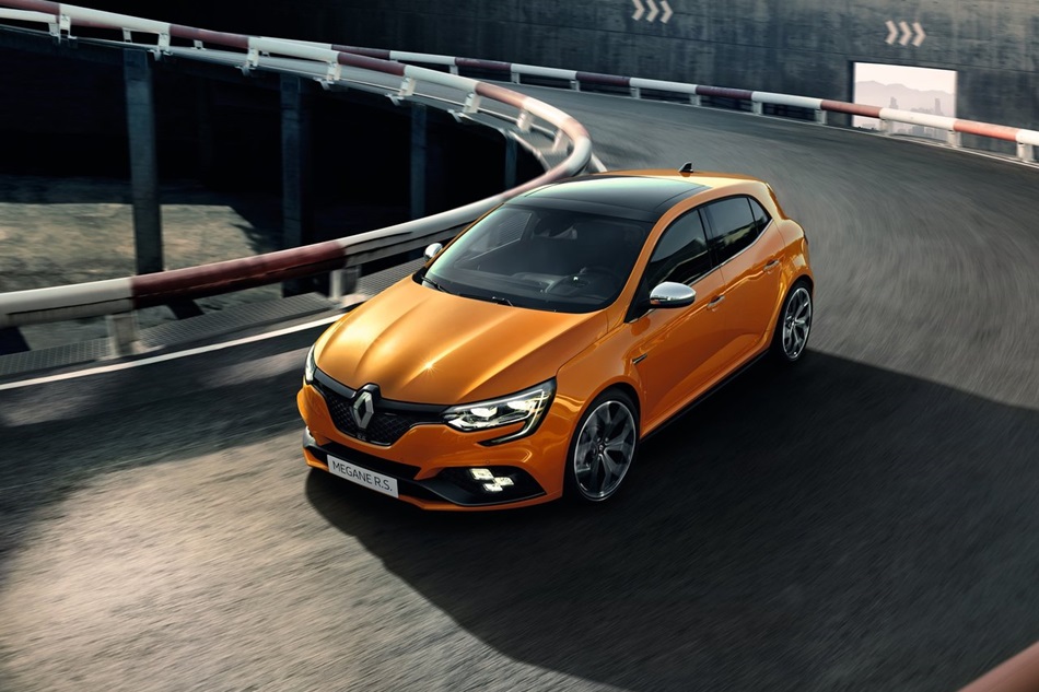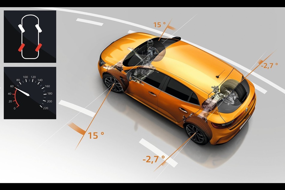 在法蘭克福車展上 Renault 發表全新 Megane RS,動力系統由原有的 2.0 公升渦輪引擎改為更細排量的 1.8 公升渦輪引擎,雖然馬力提升至 280 匹及 390 牛頓米扭力,但可惜面對 Civic Type R 及 Golf GTI Clubsport S 同級前驅對手的 300 匹馬力卻顯得不足,也因此,Megane RS 的重點落在底盤功架。搭載源自拉力賽事的液壓懸吊技術,令攻彎性能更精準俐落;而且配備四輪轉向系統,在低速時前輪轉向角度超過 15 度,後輪的旋轉角度會反方向轉動 2.7 度,降低半徑令到操控更靈敏;而當超過 60km/h 時,前輪轉向超過 15 度,後輪就會反方向轉動 1 度,使高速時有沉穩及敏捷的反應。