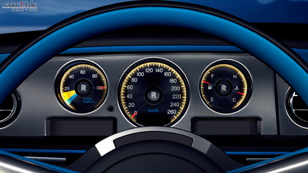 此外,儀表板上也加入了Campbell賽艇的「功率儲備」元素。駕駛者按下開關後,指針會往下指到黃色及藍色區塊,表現出如同Campbell K3賽艇最大功率的效果。鑲嵌在鋁質面板下的自訂時鐘帶有Bluebird的雋永標誌,重現K3的經典設計。