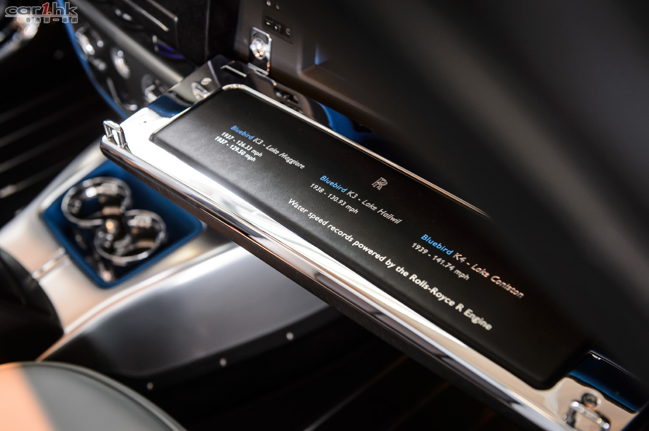 特殊調配的「Maggiore Blue」藍色車身,讓Waterspeed的內外散發出湖面般的湛藍風貌。車身採用最新科技的粉狀漆並以9層工序上色,最後再交由工匠手工打磨,確保車漆完美無瑕。Rolls-Royce大膽嘗試將車漆色彩導入引擎箱內,令視覺更添美感。經過拋光處理的11輻輪圈之中,也採用了與車漆相同的顏色,鉅細無遺。工匠用四小時手工繪製腰線,只為了將Bluebird的精髓表現得淋漓盡致。