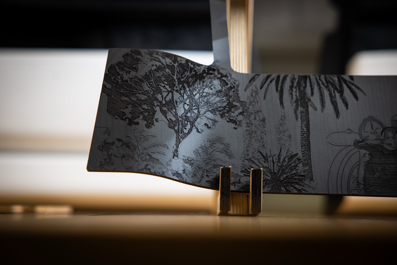 Rolls-Royce一向擅長把「材質」轉化成「情感」,而這次的木飾作品可說是極致演繹。每片黑木飾板不再只是平面裝飾,而是一幅以光影、紋理與時間構築的立體畫。從Phantom跨越百年的歷史軌跡,到象徵傳奇旅程的地圖與花卉細節,全都以激光蝕刻出三層深度的立體紋理,讓光在木紋間流動,彷彿歷史在車門上重生。
