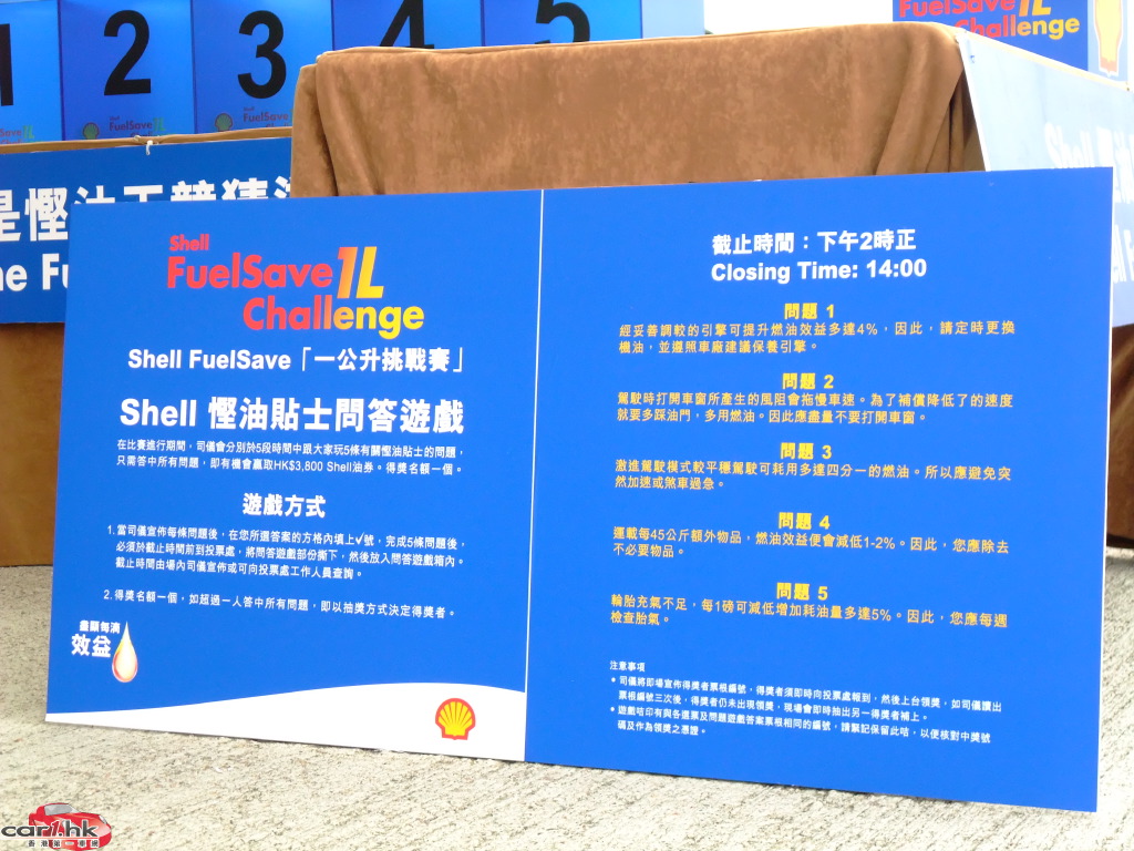 香港蜆殼有限公司董事吳毅洪先生表示:「這次舉辦『一公升挑戰賽』,目的是向香港市民展示一公升全新慳油配方汽油 Shell FuelSave 可以為駕駛人士慳得更多。很多參加者都是首次參與這類型的慳油比賽,他們對一公升汽油能走得多遠的路程都感到十分驚訝。您只要使用Shell FuelSave 汽油,就能夠每缸油慳高達一升,再配合實用的慳油貼士便可以去得更遠。」