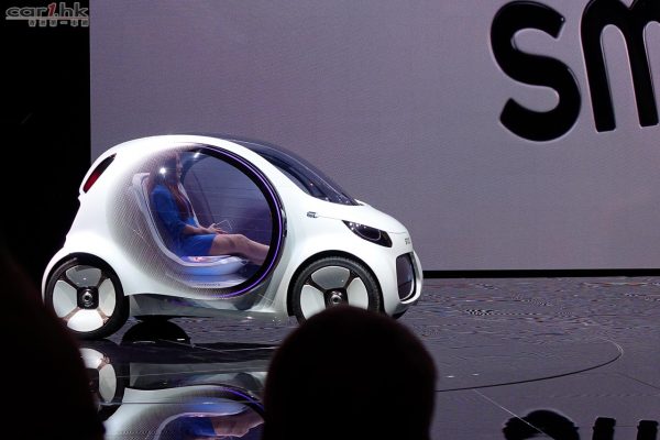 未來汽車發展會是怎麼樣,再次由 Mercedes 展示出來,在法蘭克福車展中,smart vision EQ fortwo 將是一部全自動駕駛交通工具,它同時是 EQ 電動車,也是 Car2go 汽車共享的工具。為了令 smart vision EQ fortwo 充滿未來感覺,車頭擁有一個大型顯示屏,可以顯示不同的資訊,車門是全透明上揭設計,雖然車門是透明,但是可以演變出不同圖案、顏色,用意配合不同環境、乘坐者的心情需要。這部 smart vision EQ fortwo 的外型可以看到是由現在的 smart 演變出來。由於它已經達到第 5 級自動駕駛,車廂入面再沒有軚盤,只有一個顯示屏在乘座艙。這部車體積為 2,699 X 1,720 X 1,535mm,比現有的 smart 大了一點。這部可愛未來小車,擁有 30kW 電池,後輪驅動,大概可走 300km,由於此車已經支援了無線充電,只要配合無線充電站已可充電,另一方面,也可以將車內電池的電力回饋回電網之中。