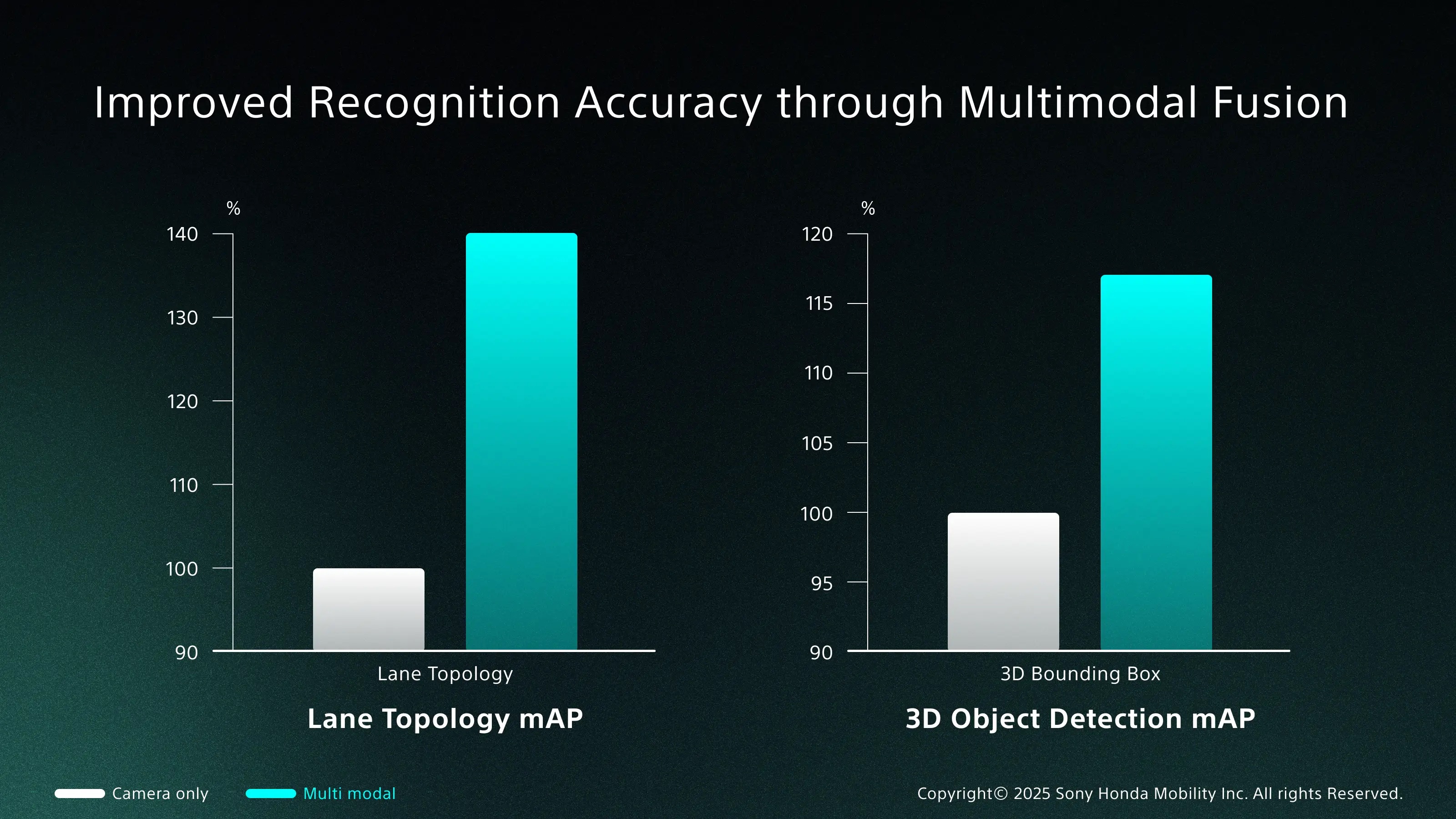 AFEELA的開發團隊相信,車輛的智能不應只依靠單一感測器,而是要融合 LiDAR、雷達、攝影鏡頭、地圖、里程計等多重資訊。這種「多模態AI」讓車輛能在現實環境下展現更高的準確度與穩定性,逐步接近「能夠理解世界的AI」。
