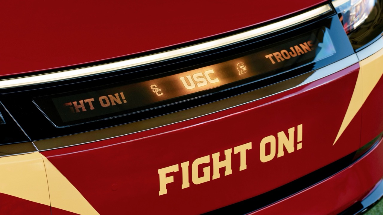 這次展出的USC主題AFEELA 1,以學校代表色Cardinal紅與Gold金打造專屬車身包裝,外觀充滿戰意;車內的氣氛燈、屏幕介面與聲效(e-Motor Sound)亦全面換上USC風格。更特別的是,AFEELA的媒體光條(Media Bar)外顯USC × AFEELA專屬動畫圖案,令車輛在場館燈光下極具舞台感。