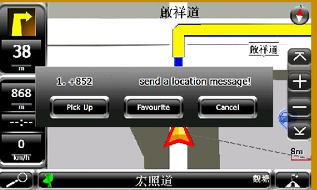 在 Google Play(Android Market)下載 app「 Pick Me Up」後,就能夠以 SMS 短訊,分享位置給裝有互聯網導航機 GPS-Bay Connected Type 1(需安插SIM卡)的車輛,導航機收到短訊後可即時顯示朋友的位置,並規劃路徑出發至該地點,接載親朋好友夠晒方便。而且此功能無需上網,粵港澳都得 ,即使不小心在大陸失散了,也可輕易尋回家人。(「 Pick Me Up」軟件可用手機的 GPS 或 Wi-Fi 定位,Wi-Fi 定位差距可達 500 米,GPS 則約 15 米,所以建議最好開啟 GPS 定位會較準。)