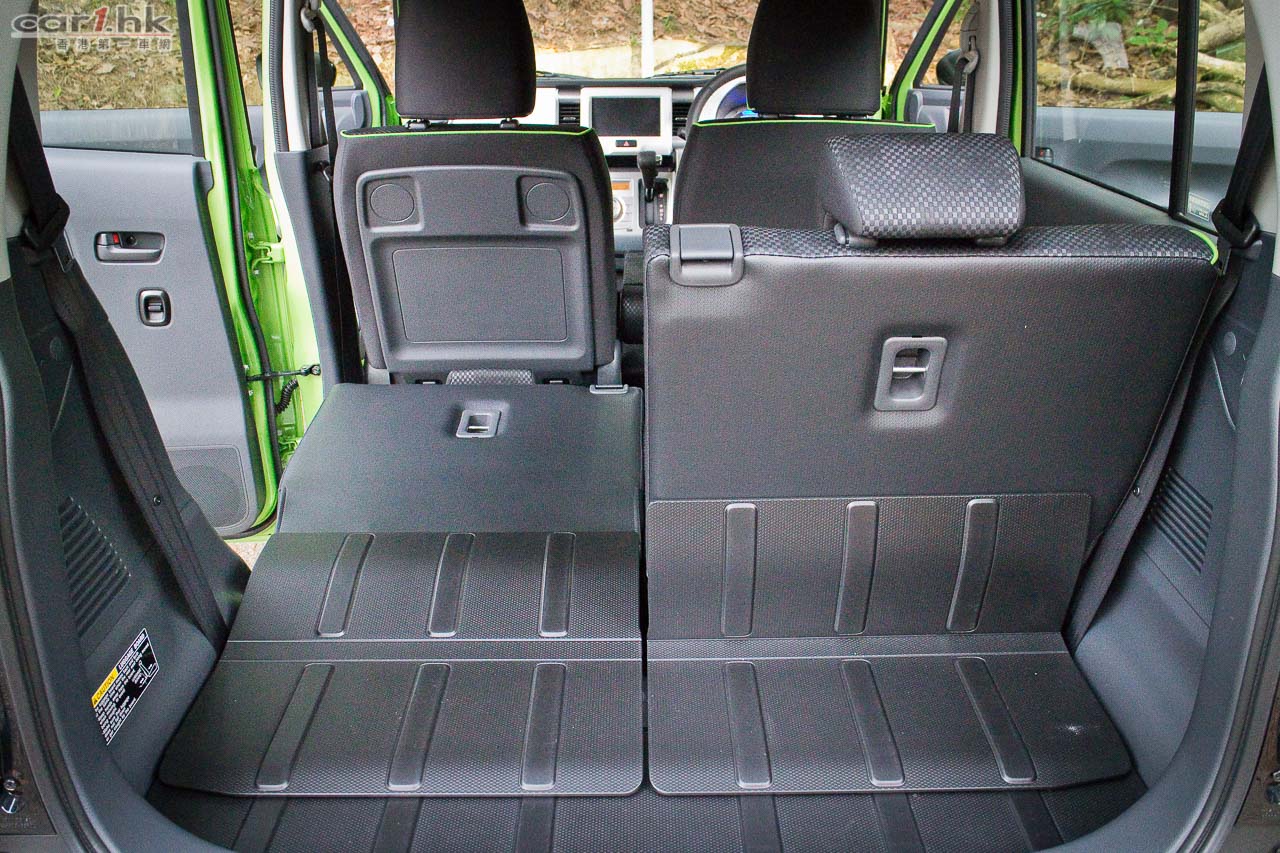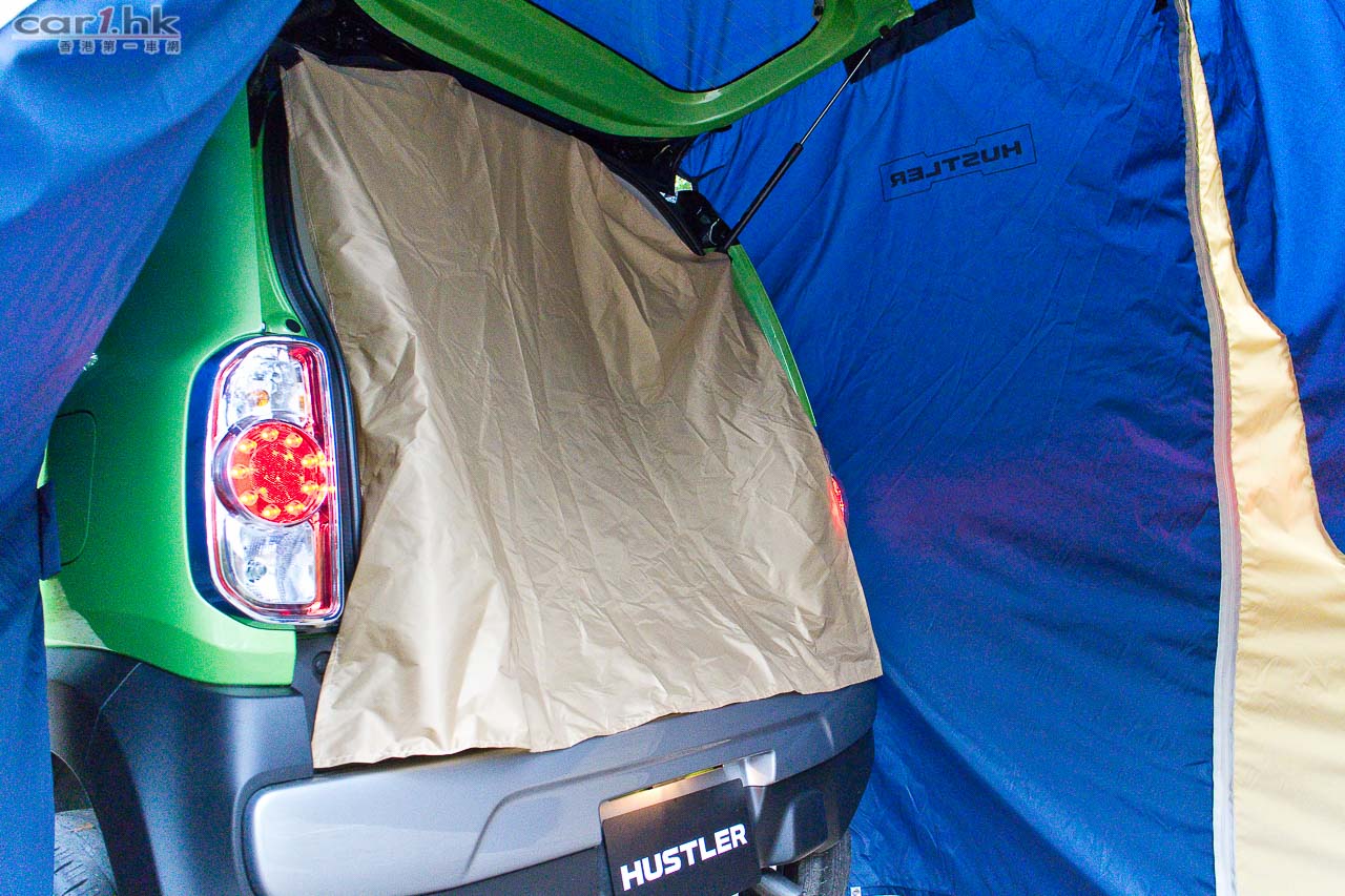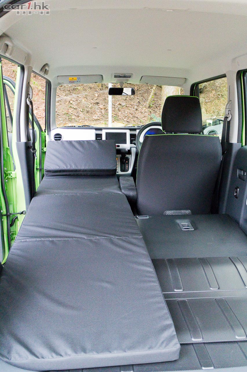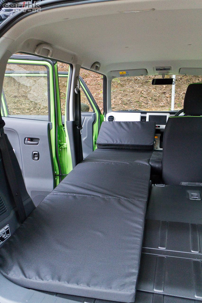 進入駕駛艙後,會感到 Suzuki 在 K-Car 身上的配置絕不手軟,如三幅式多功能軚環、單圈、單色 LED 多功能顯示錶板、恆溫冷氣、大量置物箱、杯架、掛物小勾、Sport 模式鍵、前座暖椅、免匙著車系統,一應俱全。前座乘客位可翻平當餐桌,再配合後座翻平配床褥,可變成流動露營小天地。今次代理還引入了帳幕配件,為喜愛露營的車主來說,更衣、擴展置放行李空間都十分方便。