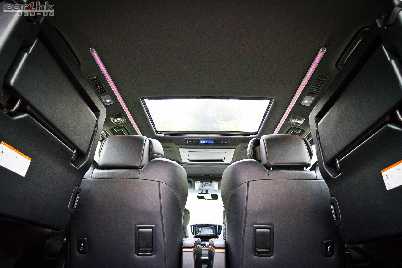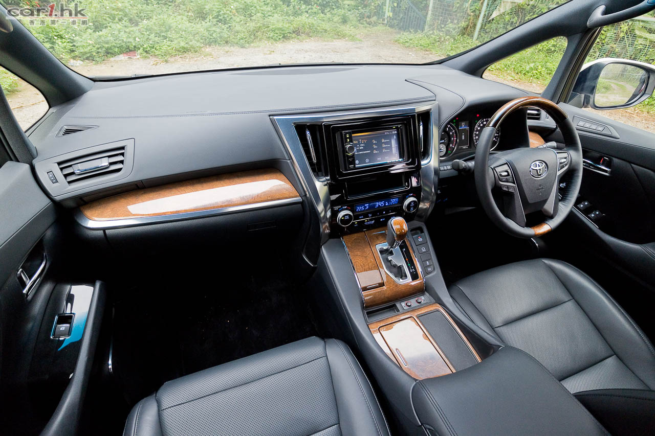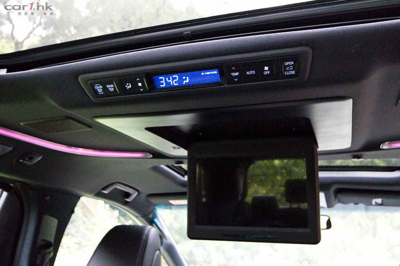 今次試駕的是頂級版 Toyota Alphard Executive Lounge,索價 $725,000,而 Alphard 350 $666,000,注重乘坐享受的話,Executive Lounge 是唯一選擇,試了一天後會發現這個差價絕對值得付出。Executive Lounge 重中之重是中排的好似飛機頭等艙的電動大班椅。兩樣座椅的功能一樣,舒適感方面可說是同級最好之一。椅背和腳墊都是電動式調校,令乘客者更易調校到適合自己的位置。冷暖座墊、獨立頭頂照明燈、隱藏式工作台,令到這部 Toyota Alphard Executive Lounge 即時化身流動工作間。車椅還有椅架、手機架,設計得非常貼心和緊貼用家潮流。車椅中的頭枕加入頭部固定墊,令長時間車上睡眠休息更得舒服。全車飾件以啡色桃木紋為主,添了不少貴氣。頭頂就是大型天窗,添加不少空間感。車廂內加入了氣氛照明燈,乘客可以在 16 隻顏色中選擇,揀岩適合自己的顏色對放鬆身心有一定幫助,亦為車廂添多份美感。近年很多豐田汽車也加入了納米離子空氣淨化功能,Alphard 也不例外,還在中排位置可以找到納米離子空氣淨化器的輸出口。