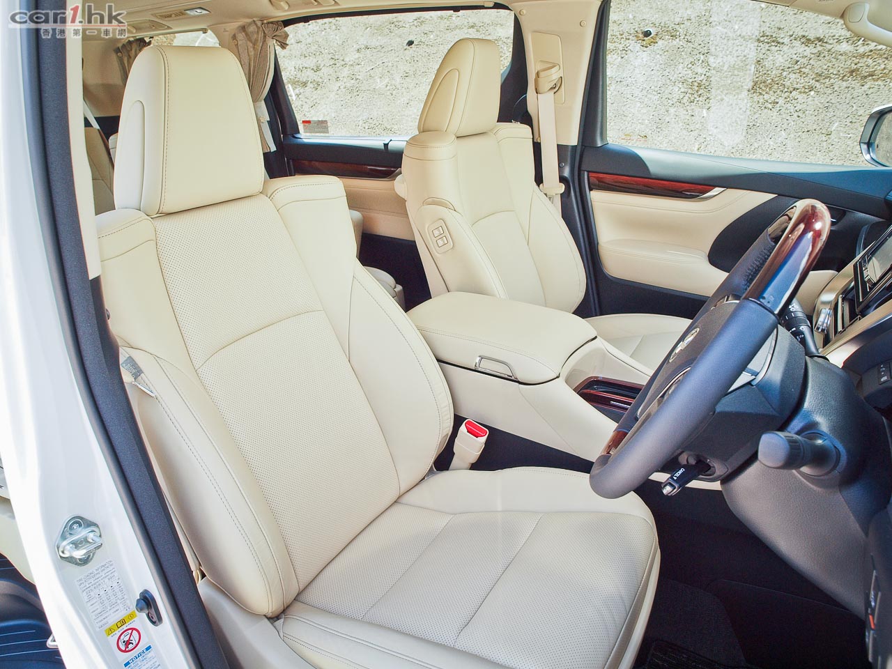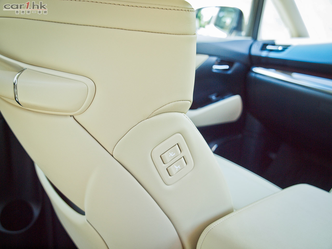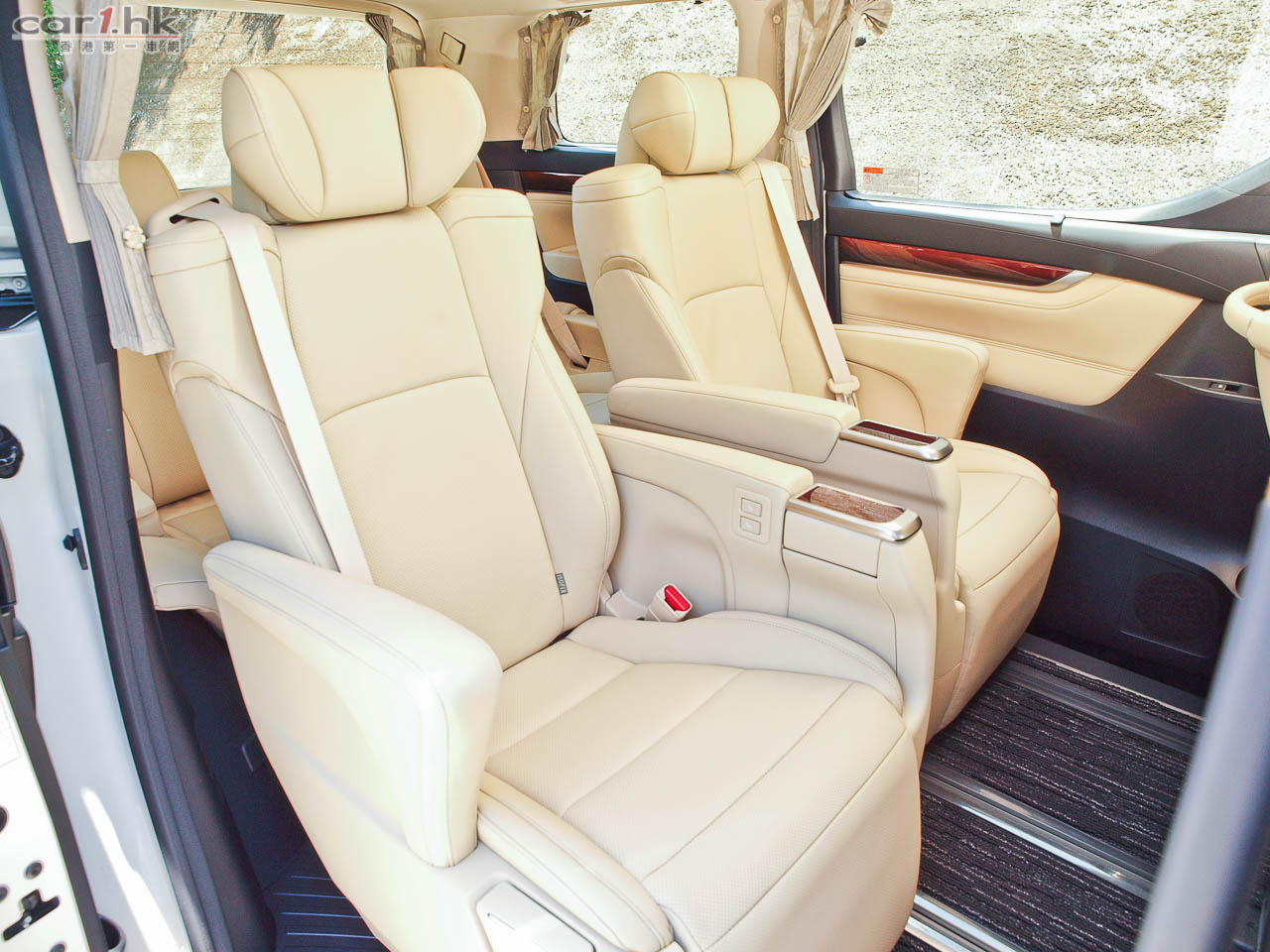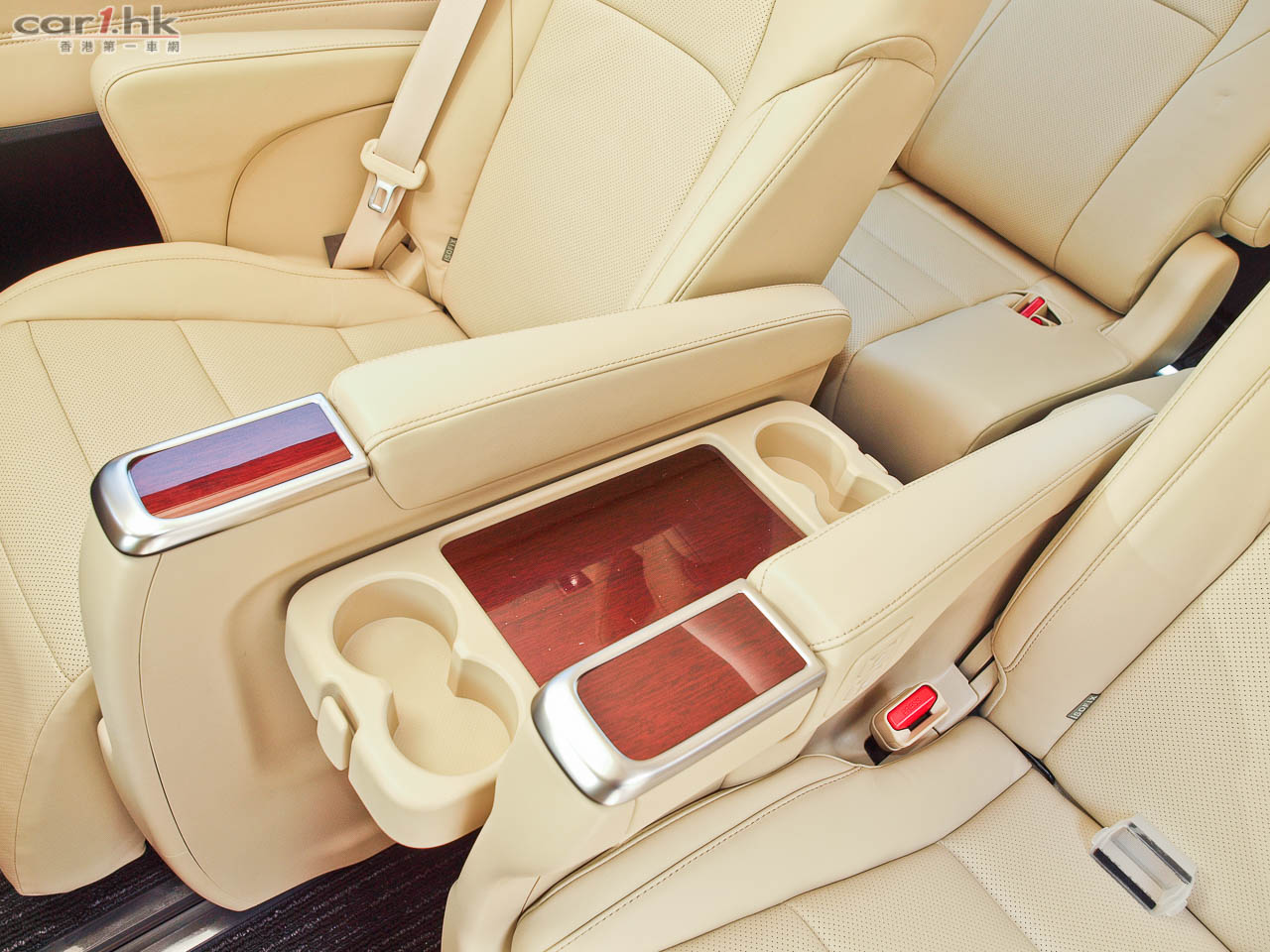 我們最先測試的Executive Lounge版本Alphard 350,中排有一對豪華得令人留連忘返的頭等式獨立座椅,有多角度電動調校和電動小腿墊、semi-aniline皮革、特厚頭枕、冷暖氣和多功能控制panel、暗格/抽屜/杯架/工作枱等,Alphard hybrid的一對則採用Flaxen leather皮革,同有電動調校椅背和小腿墊,功能較少,但當然依然豪華。
