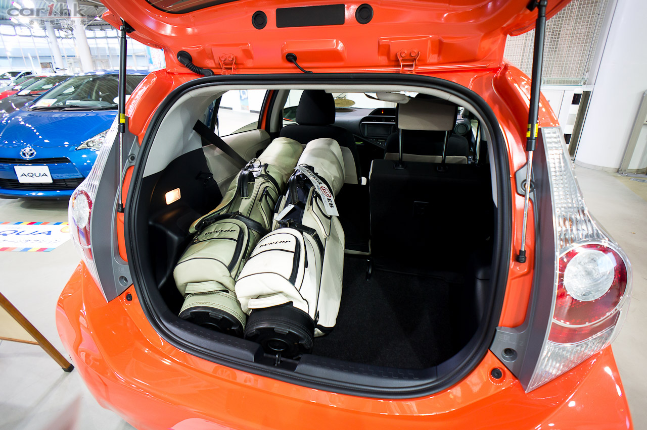 為突顯這架車的實用性,Toyota 準備好兩個高爾夫球袋放入 AUQA 車內,展示車身小但空間並不細小。