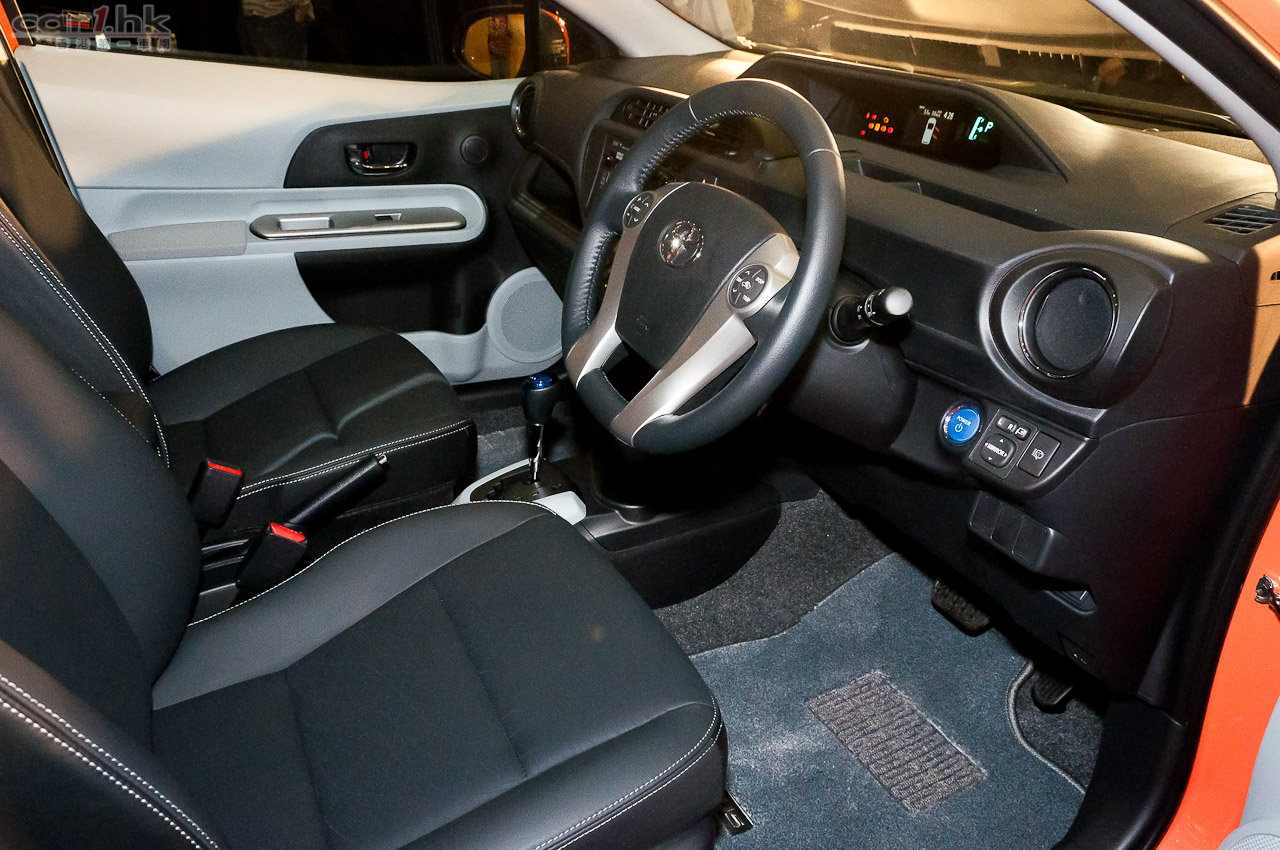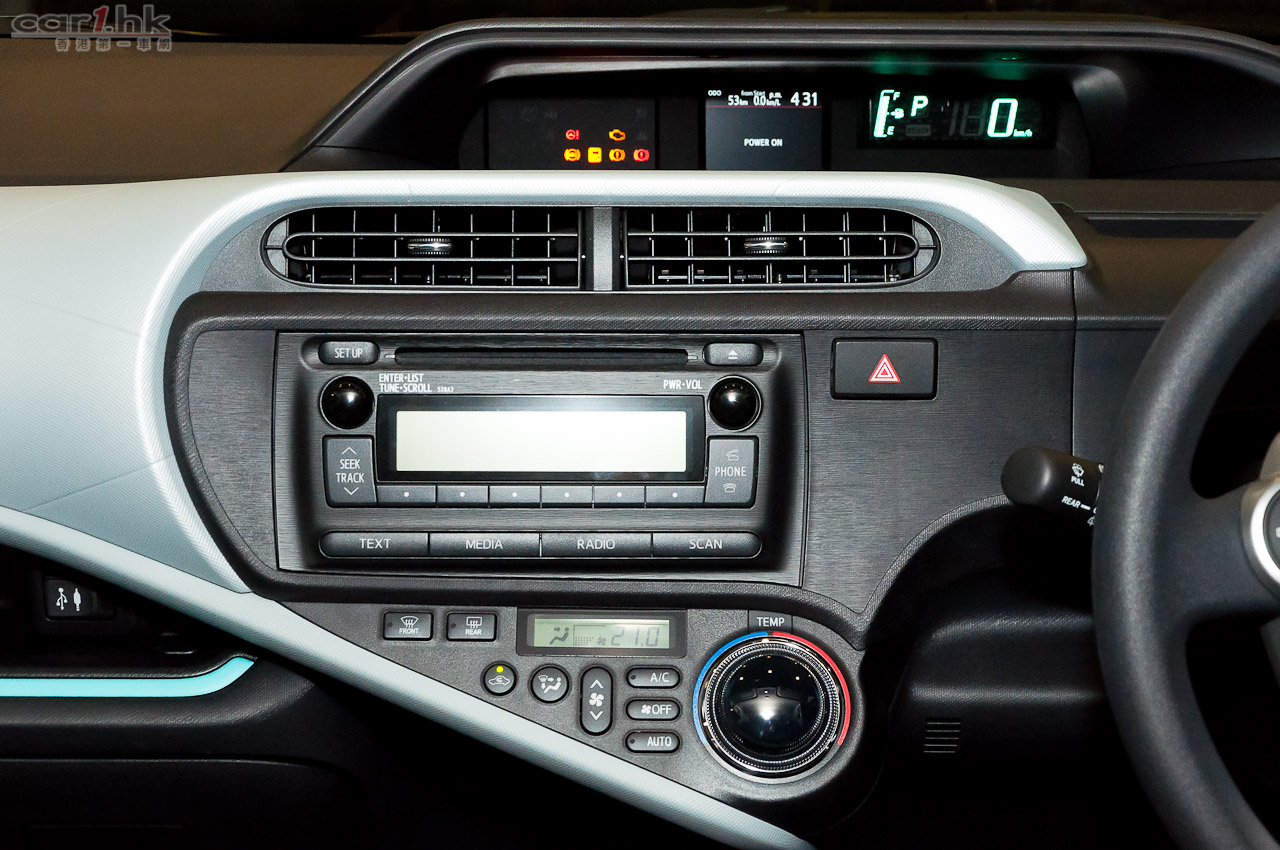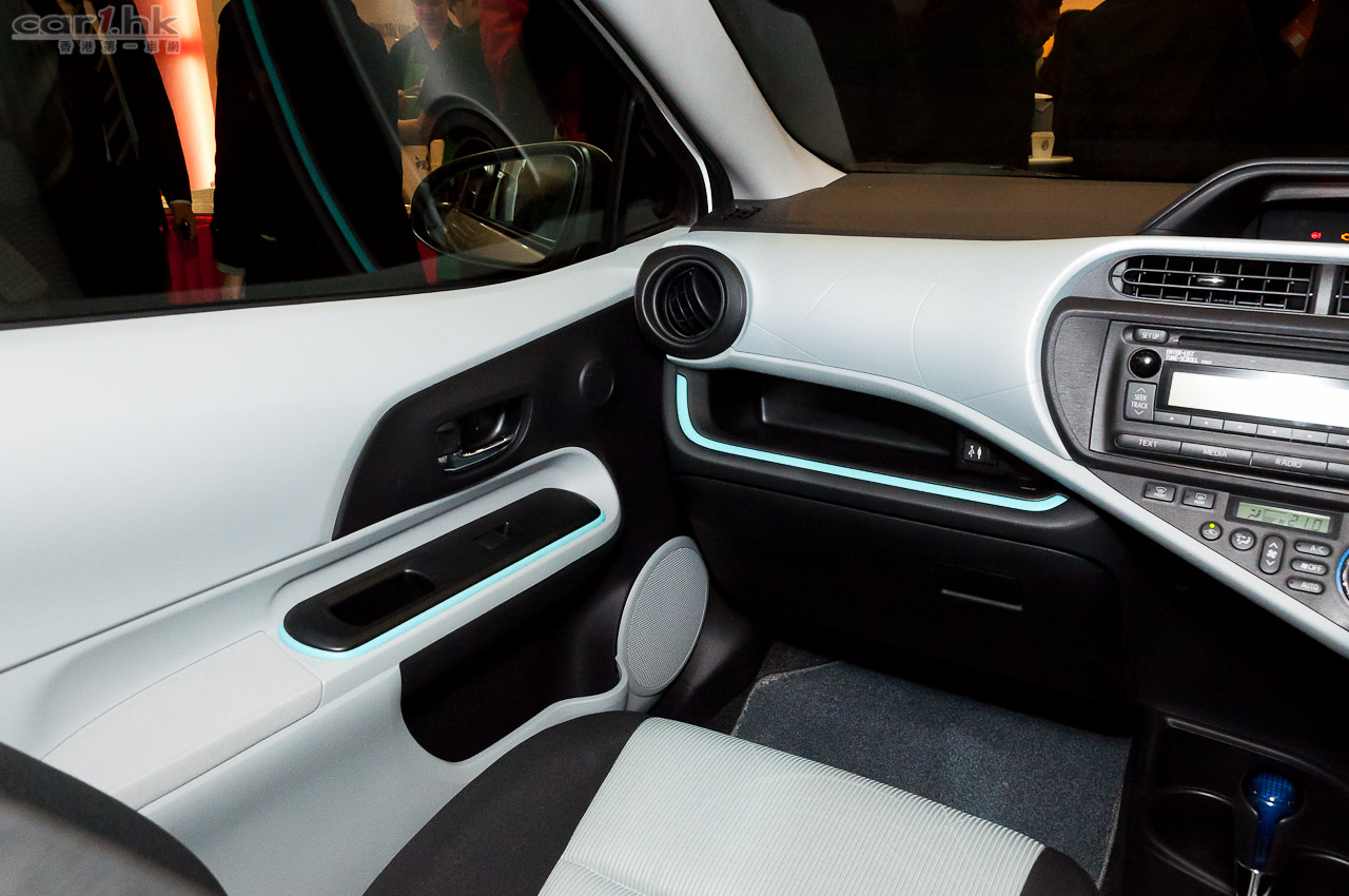 內籠方面,中控台設計採用 C 字型,完全配合 Pruis C 的「City」主題;配備 3.5 吋彩色顯示屏、鐳射數碼音響系統、智能車匙及按鈕啟動等設備。雖然整體車身 Pruis 細,但車內空間仍然十分寬闊,即使 6 尺高男士坐於後排,頭部亦不會撞向車頂。而 Champion 版比標準版多了 LED 頭燈連自動光線調校、車頭燈清洗裝置和優質皮軚環。